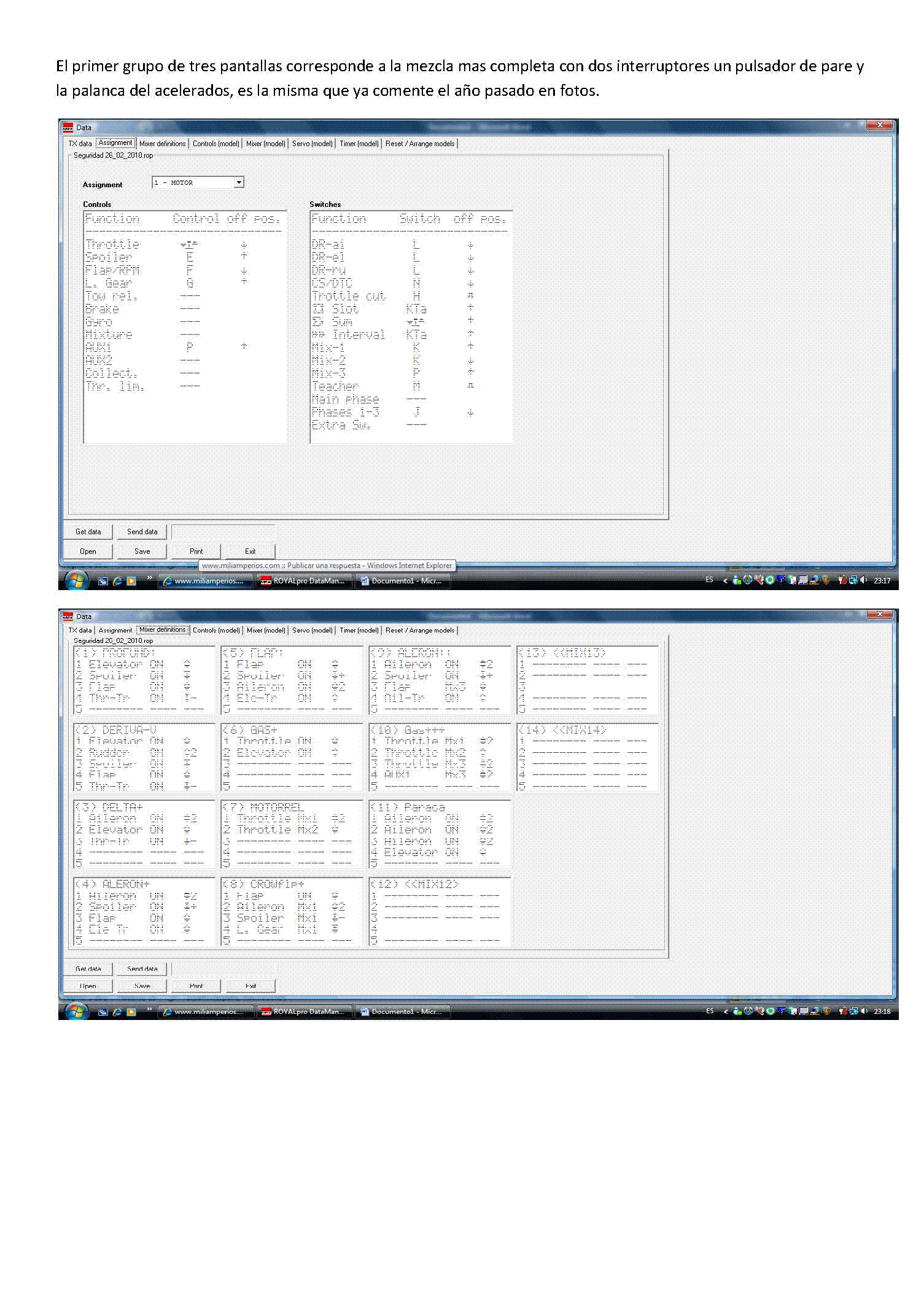 2.- Continuando en el menú Setup, Setup->Asignaciones->Conmutadores se asigna a la mezcla Mix2 a la palanca N con la posición "abajo". Tiene que ser la misma posición que hemos definido en el apartado 1, que es lo que hace que se posiciones el mando del GAS al ralentí que queramos.
