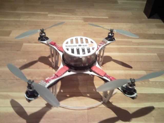 El de la foto es el modelo más pequeño que he contruido. Es un QuadX de 270 grs. de peso con modo autoestable. Con baterias de 1000 mAh 2s tiene una autonomía de 12 a 15 minutos. Es muy nervioso y sirve tanto para vuelo interior como exterior.