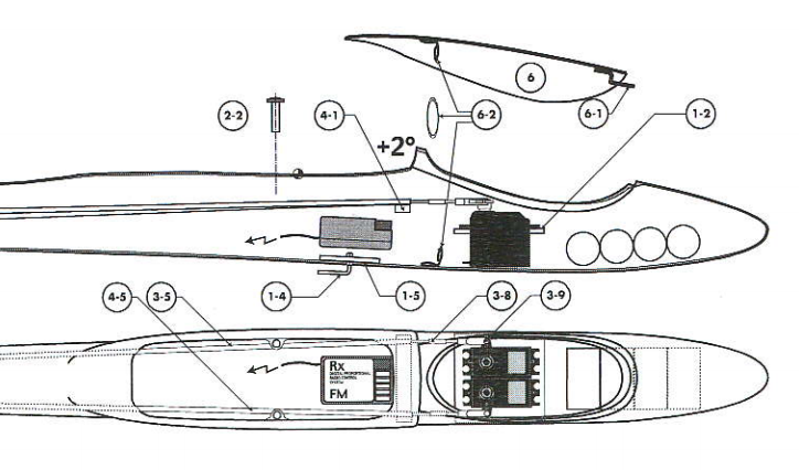 Me da un poco de vértigo ese volumen interior, y el peso asociado. Está pensado para dos servos estándar de 45g cada uno en la cabina para la cola, y una batería Ni-MH de 4 elementos, 1300mAh, que serán otros 80g o 90g. Se supone que con eso el peso en orden de vuelo son unos 900g.