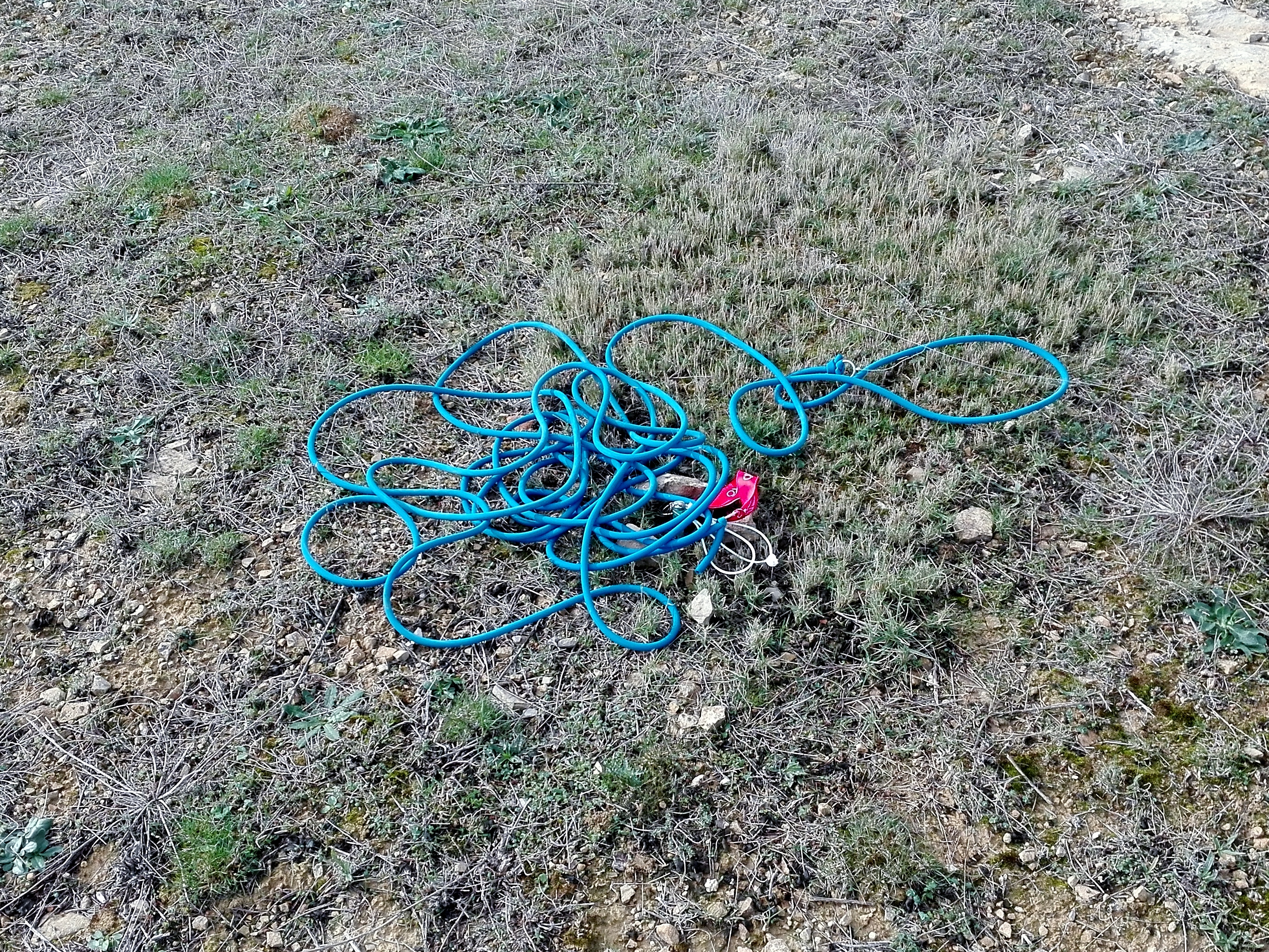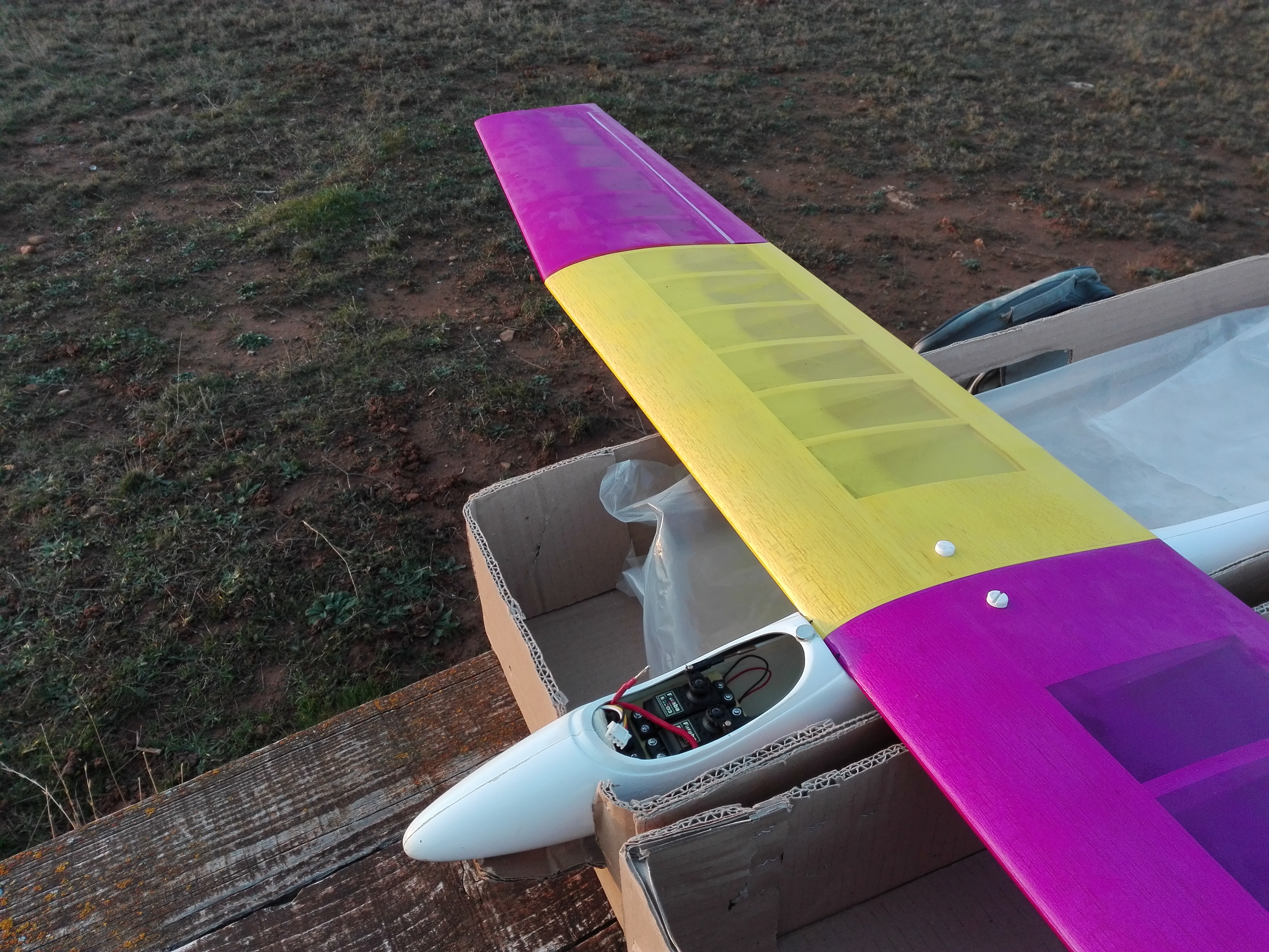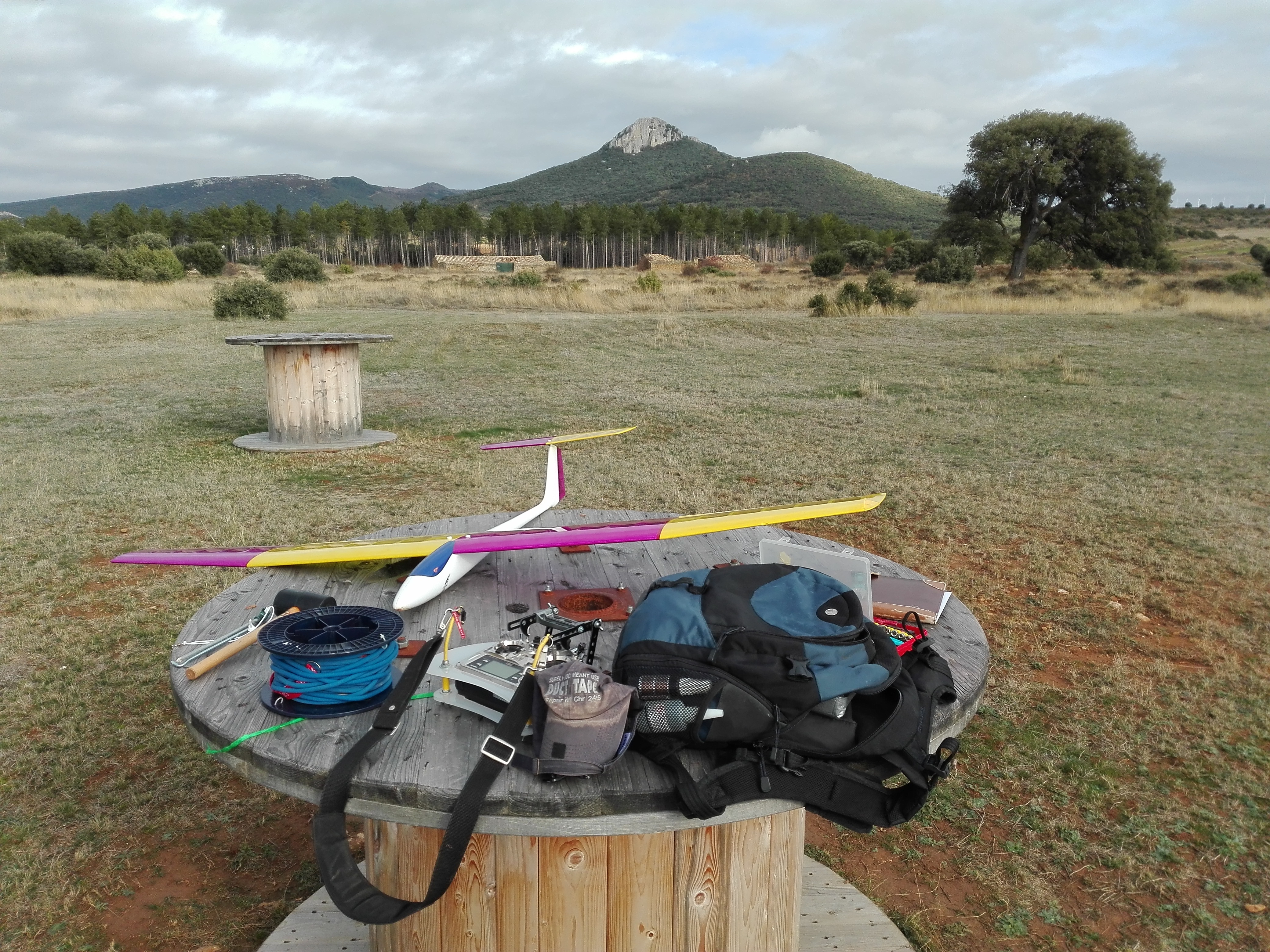 El 23 de diciembre eché unos vuelos moviendo el gancho al quinto agujero, para probar también el despegue sólo con reflex. Fue un día bastante raro, frío (8ºc) y volando por la tarde en vez de por la mañana. Básicamente, porque en todo el día no había levantado la niebla. Viento en calma total... Pensé que un buen momento para asegurarme de que no había influencias extrañas. Aproveché para sacar las distancias para 3, 4 y 5kg, que pondré más adelante en otro post.