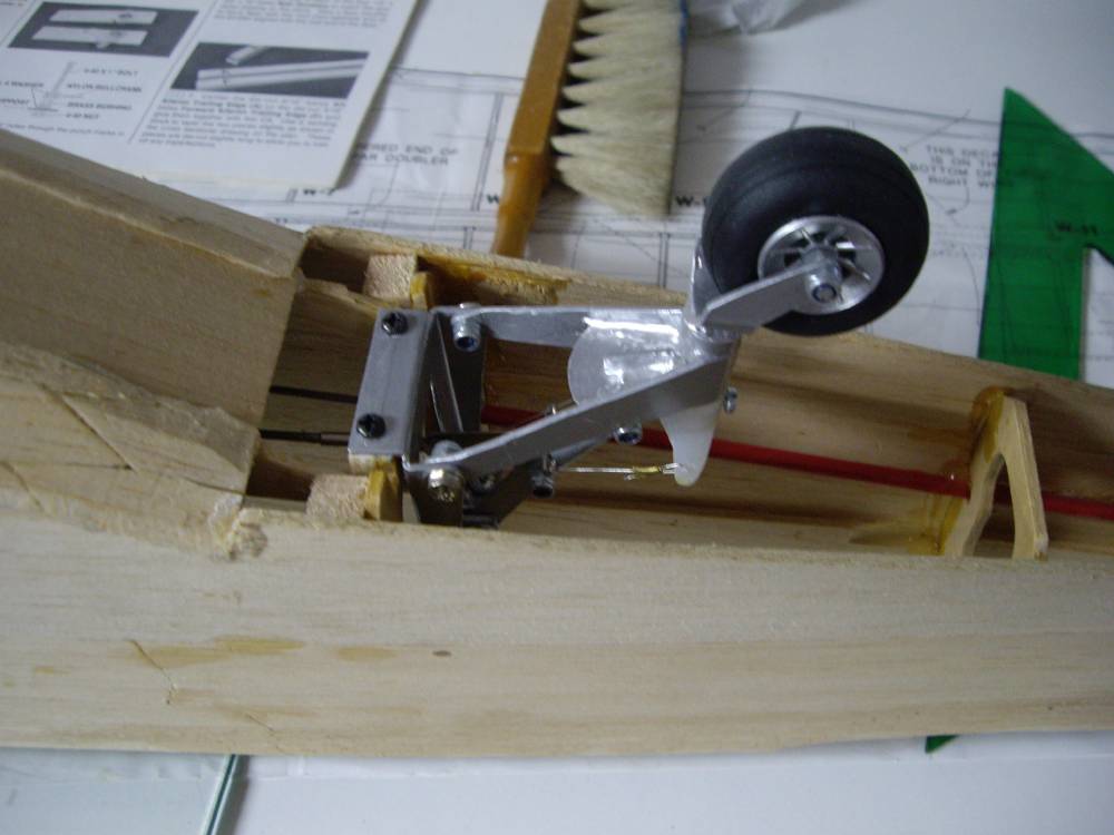 Segunda modificación importante; el tren delantero y portalones de cierre. Esta hecho en dos partes, la parte inferior que va sujeta al ala en aluminio y la parte que recoge la rueda en acero aprovechando la que trae el Kit. Tras ver algunos trenes comerciales, procedí a su realización, torneando la caña de aluminio e introduciéndole un muelle interior para que hiciese las funciones de amortiguador y vaya si lo conseguí va perfecto. Los portalones de cierre son de aluminio, aunque forrados de la misma lámina para que todo el conjunto vaya igual.