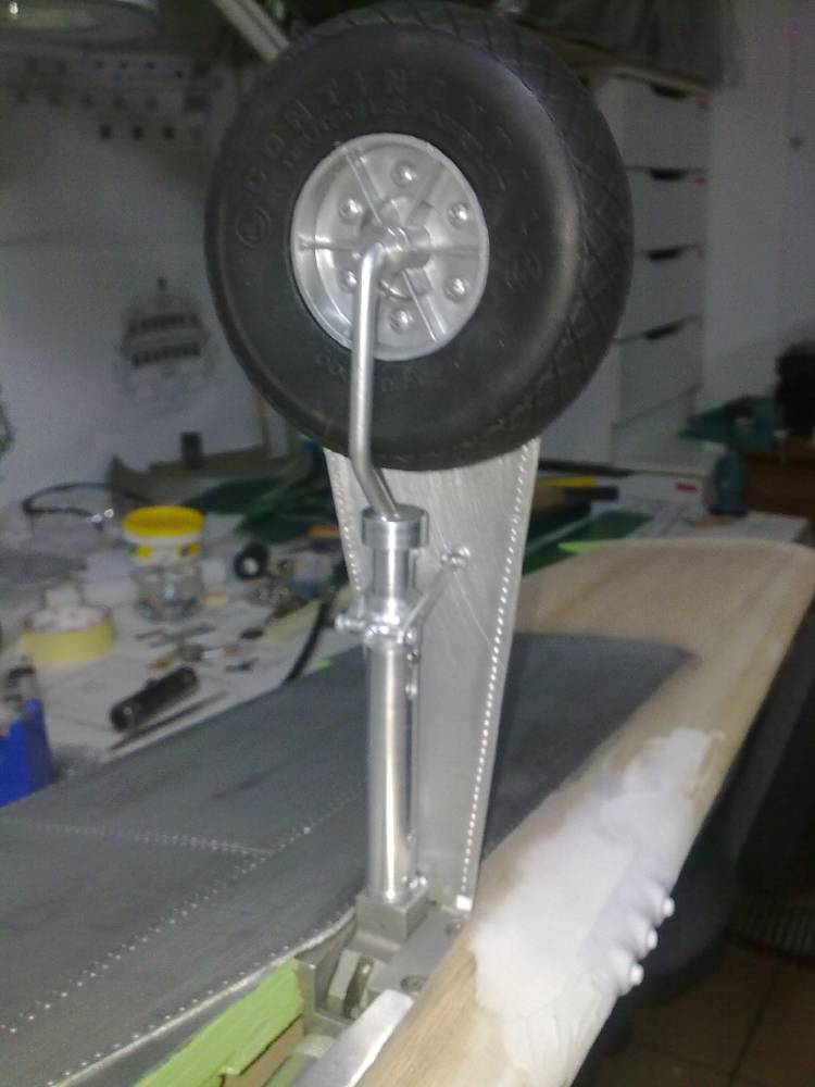 Primera modificación importante; el tren trasero retráctil totalmente direccionáble. Esta hecho en aluminio, y aunque no es el que realmente monta el avión real, da el pego bastante bien y bastante funcional. Lo copié de uno de los trenes traseros que la marca Robart tiene en PDF en su página web totalmente despiezados y acotados. Gracias Robart.