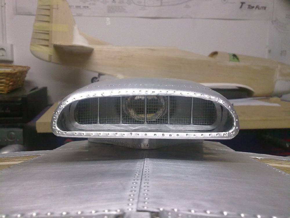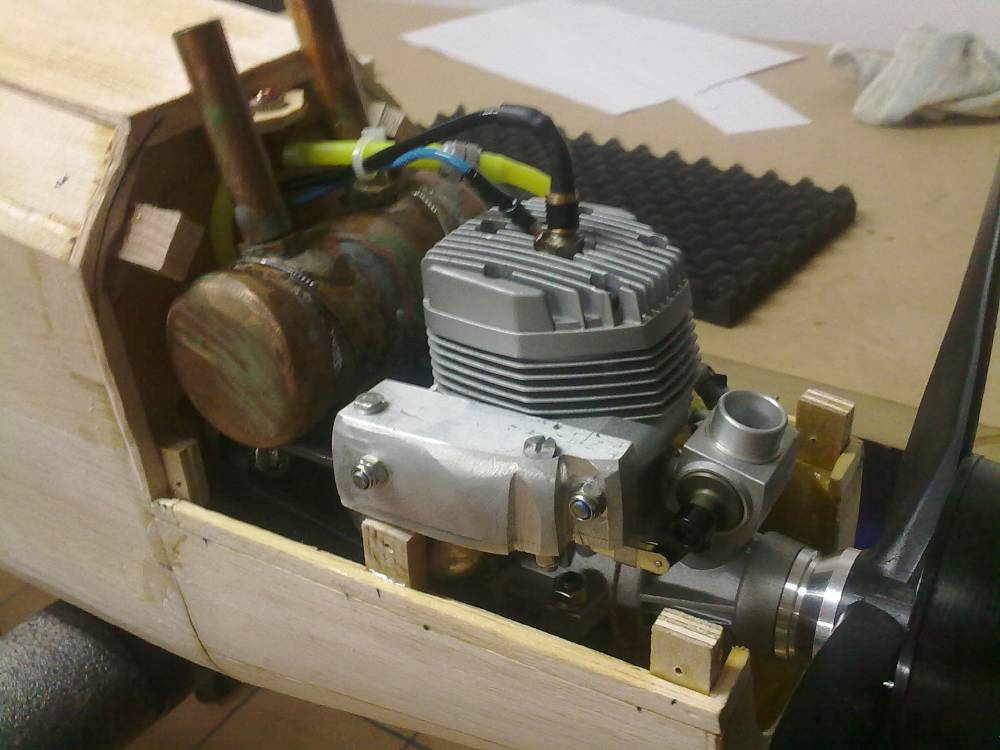 Si os fijáis en la foto del escape de cobre podéis observar como el motor está bastante más adelantado, de forma que la hélice no queda a ras del fuselaje, esto es así en el avión real, motivo por el cual me he visto obligado a realizar un cono un tanto especial del cual no tengo fotos. En la última foto se aprecia donde va alojada la toma de combustible y cables de encendido de la bujía y como queda todo el conjunto a falta de los retoques finales.