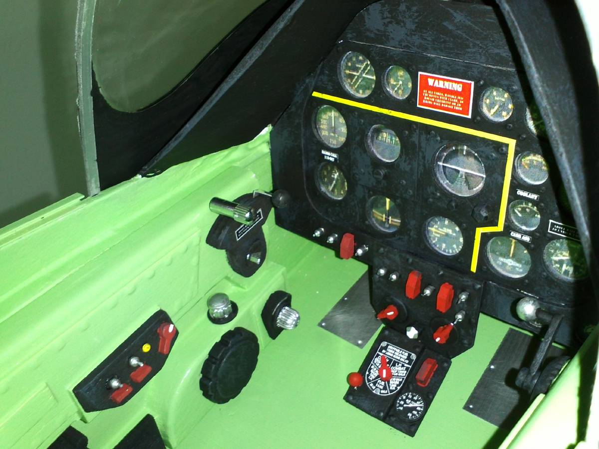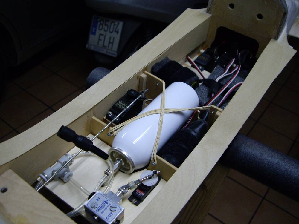 Por último en las fotos podéis apreciar el sistema neumático con la botella en medio y el servo que lo acciona, así como una zona bien camuflada delante de la cabina del piloto donde van el encendido, comprobador de batería, carga de baterías, carga de aire y regulador para el tren delantero y toma del chispo.