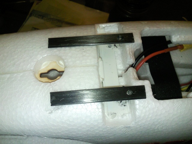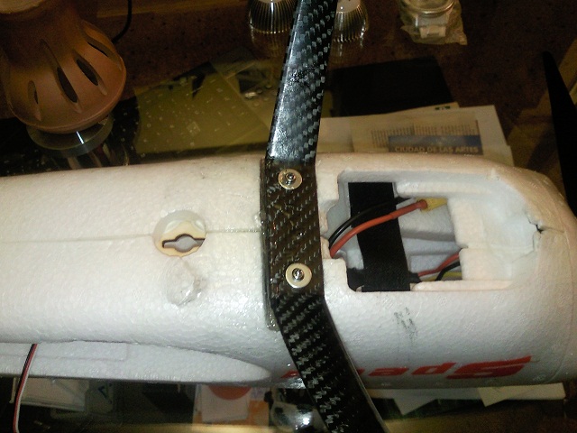 Ok socio!!!!!!!!! Haber te explico,yo lo que hice fue hacerle rayajos con un tornabis de punta plana al plastico donde se atornilla el tren de aterrizaje que viene de série hasta dejarlo casi todo rayado por completo porque así de esa manera el epoxy agarra mejor,fijate que el el anclaje ese de plástico viene como con una capa brillante y el epoxy no acaba de agarrar bien.Luego yo lo que hice fué cortar maderas a medida como el anclaje ese blanco de plástico y coloqué tres,una encima de otra con epoxy entre medio de cada una como si fuera un sandwich y por supuesto la primera pegada al anclaje blanco con una buena dosis de epoxy.Luego compré tornillos de esos largos y gruesos para muebles y atornillé el tren de carbono que compré a las maderas y por último por la parte de dentro(donde va la batería)le hice un refuerzo con epoxy a modo de bisagra justo por la parte de debajo donde va pegado el anclaje blanco para evitar que en un aterrizaje brusco este se arranque y te deje un bonito agujero