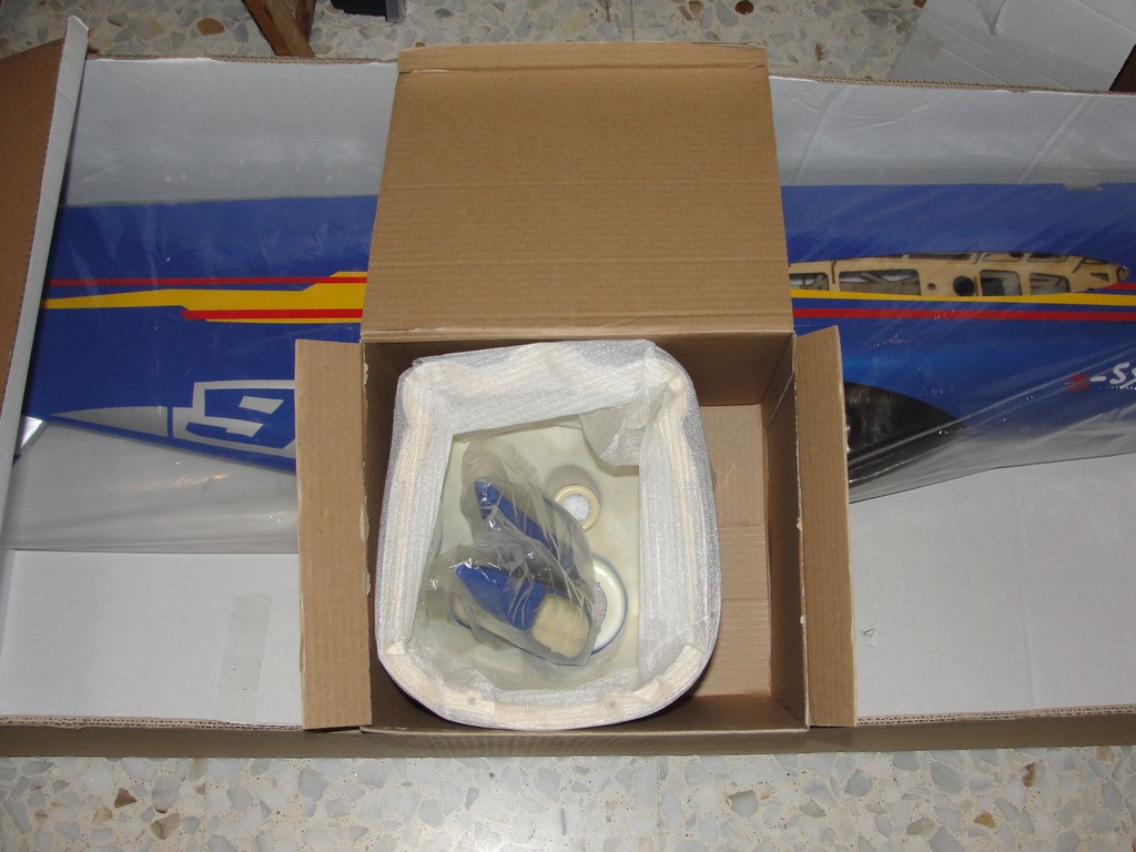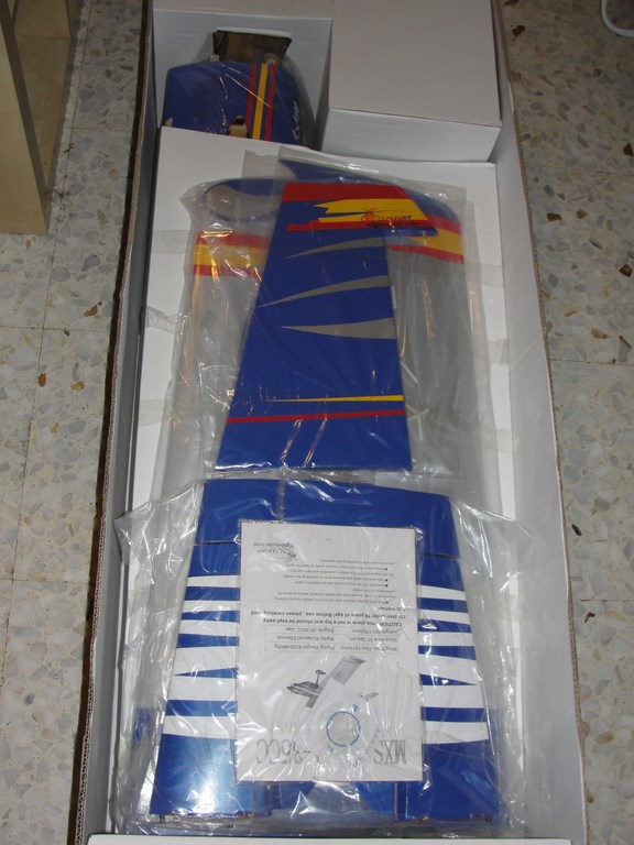 Va la caja del avion dentro de otra, y una vez abiertas las dos, el avion va dentro perfectamente colocado con cinta adhesiva o bridas en algun caso para evitar que se mueva todo, y por supuesto, todo dentro de bolsas de plastico de considerables dimensiones. Carenado, tren y patucos van en una caja separada, asi como todos los accesorios que tambien van metidos dentro de otra cajita.