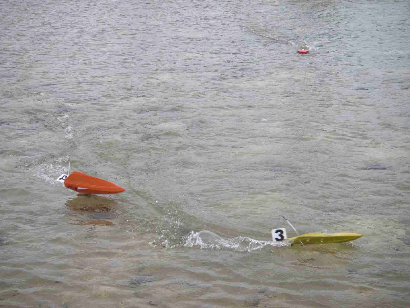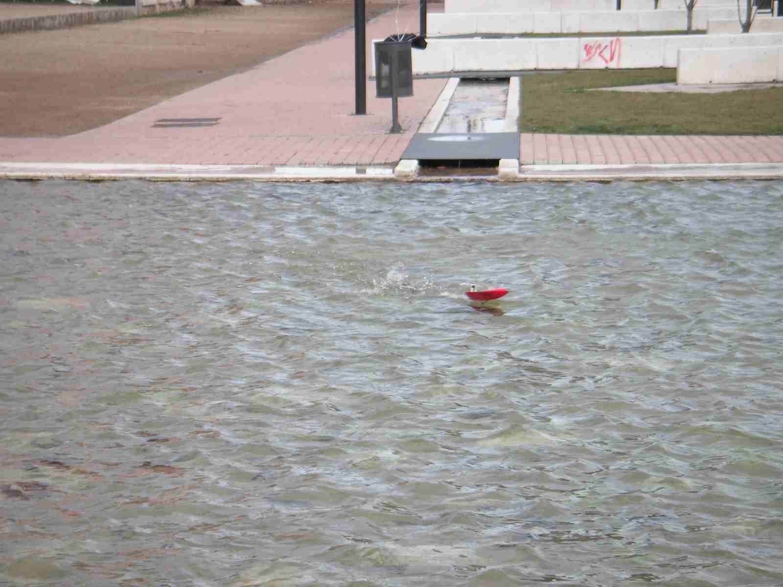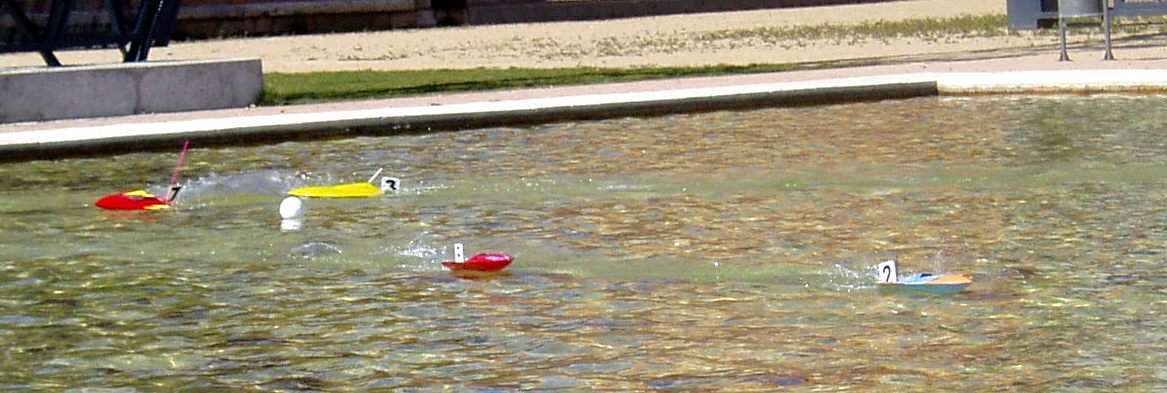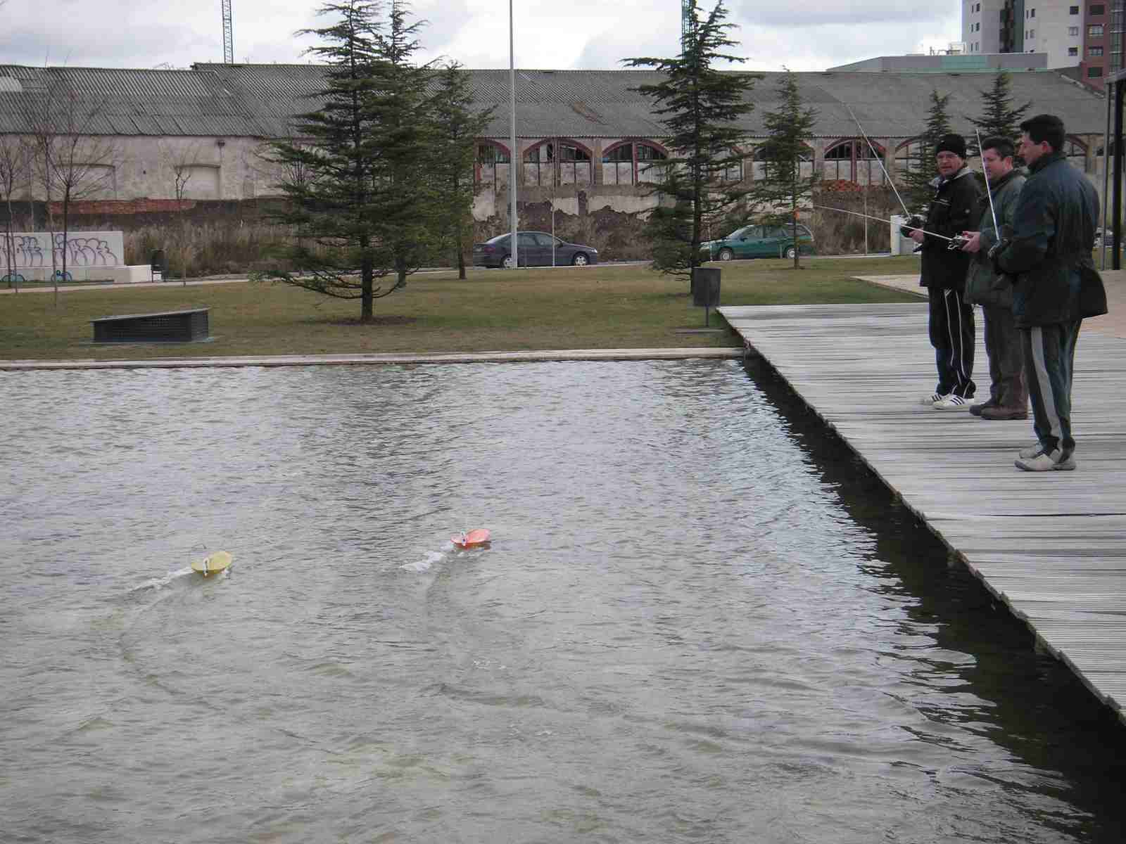 Hoy Domingo, a eso de las 12:30, hemos celebrado la segunda carrera de micro-lanchas en el parque de las norias. Se ha demostrado que con muy pocos medios se puede organizar una carrera de estas características. Cinco pilotos (cuatro aprendices sin contar al Pirata de la Estepa) y tres jueces. Fueron cinco lanchas en carrera a dos mangas de cinco minutos, con la misma bateria. Mangas muy reñidas y no exentas de complicaciones, el amigo Pirata perdió la antena de receptor, el amigo Jesús rompió piñones del servo dirección, Jose ha volcado, yo también he volcado, me han pasado por encima y creo que también he pasado por encima de alguien. Eso era la guerra, y es que íbamos como las balas.