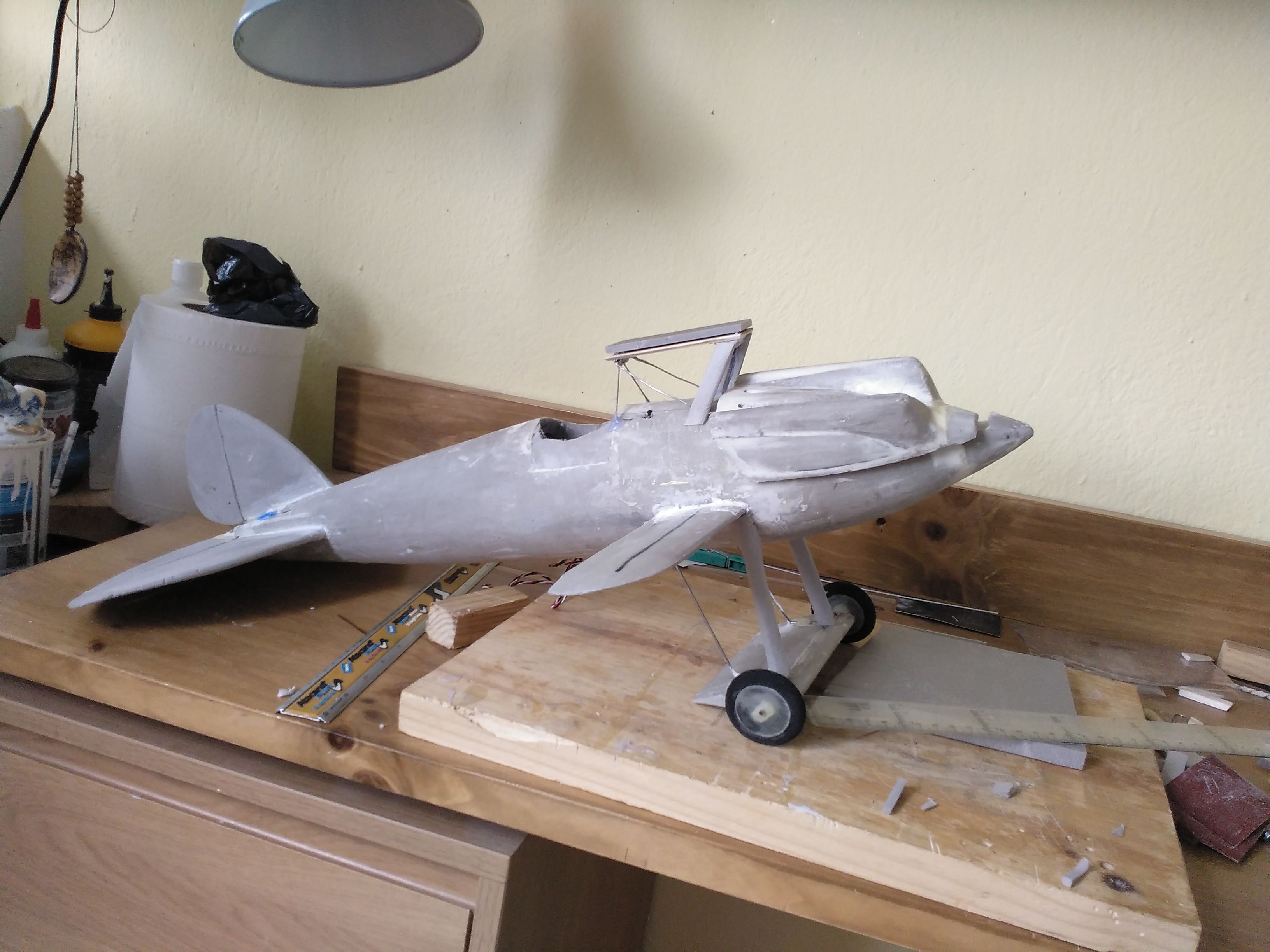.Es un currillo pro total hay tiempo, en un principio sería de 1.7 m pero si iba mal me iba a dar coraje así que lo hice de 97 cm de envergadura y un trozo de foam gris que tenía.El fuse , la pequeña alita y el asiento del tren están enfibrados en dos capas de 18gr y epoxi de laminar, previamente ahuequé el fuse para pasar mandos y quitar peso.