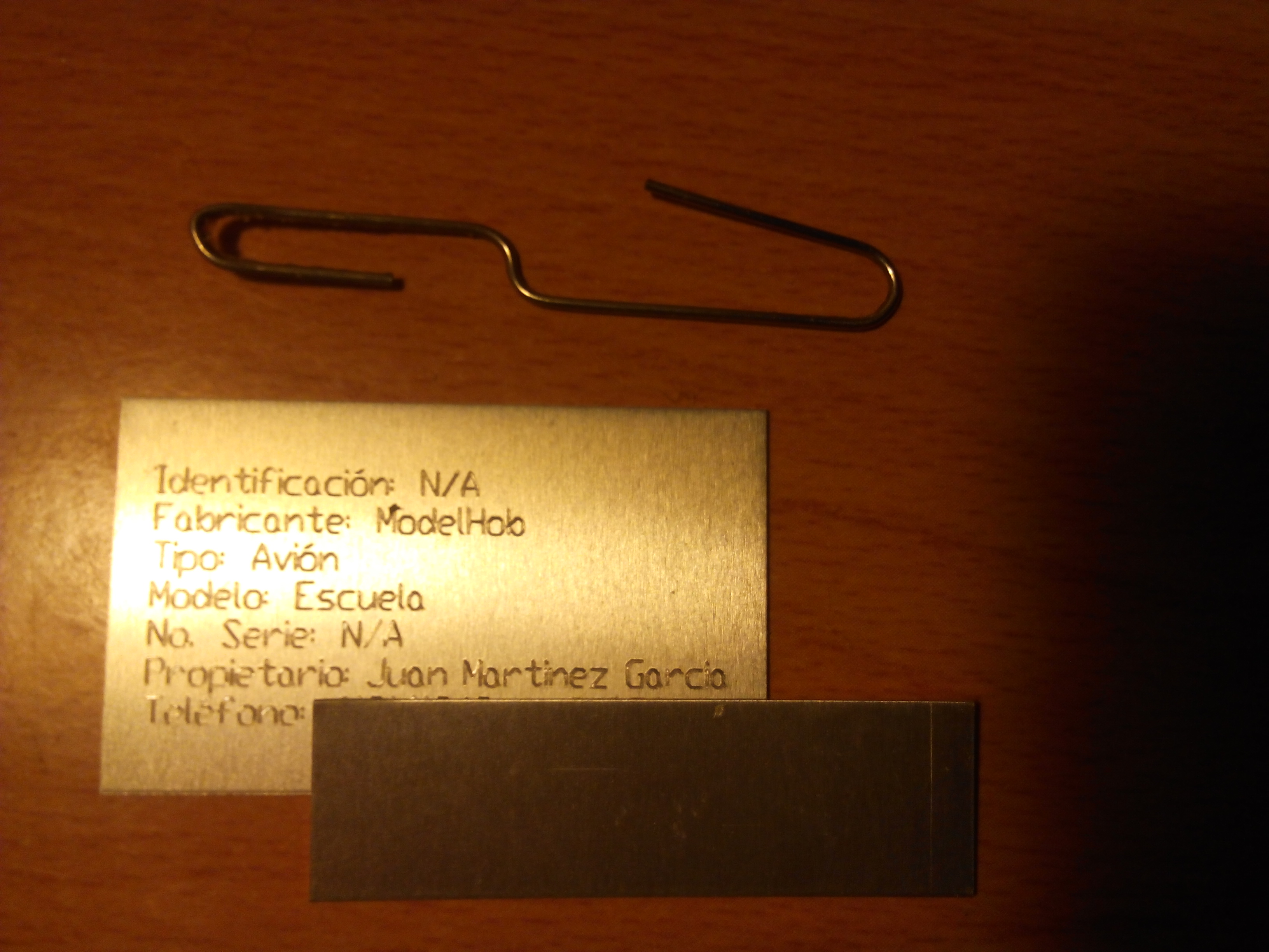 Sobre los aviones hechos por uno, si el avión es de un plano se asume que el FABRICANTE es el diseñador ya que no es un aeromodelo hecho en serie, si es un avión diseñado por uno pués uno es el "fabricante". Pienso que la propuesta de Juan y la corrección de Eduardo está muy clara sobre las placas ..... tamaño ? no se define, es una ventaja. Una placa de 5cms. x 3cms como las hizo Juan son más que suficientes para poner la información y sobra espacio, que se vuela un DLG/F3K pués la placa más pequeña que las máquinas saben ajustar el tamaño de los caracteres según el espacio. Si tienes 30 modelos, que diferencia hay si tuvieras 30 coches en el aparcamiento ? tendrían la matrícula los 30, no ? la ley es CLARA, hay que identificar los aeromodelos y si vuelas por libre TAMBIEN debes identificar la emisora. La placa cumple con la norma si es IGNIFUGA y contiene la INFORMACION REQUERIDA según la norma, no hay NADA que interpretar.