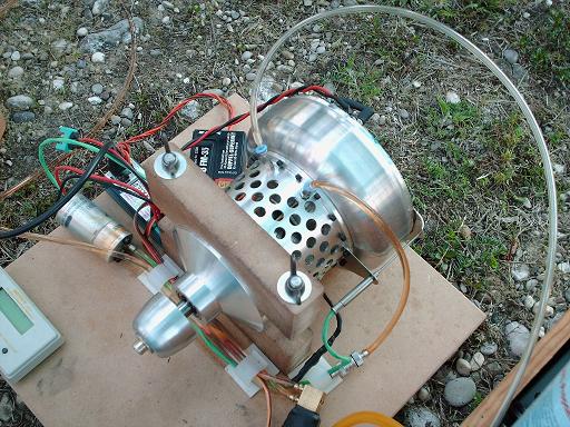 Pues el invento es a partir de un rotor de turbo de coche con un engranaje en la punta de la tuerca del compresor, que ataca a una reduccion epicicloidal con 3 engranjes de unmaterial plástico que no recuerdo el nombre, y que está situado dentro de lo que en las fotos es el soporte del motor. El compresor y la turbina están espalda contra espalda, y los rodamientos están por delante del compresor, el cunjunto turbina-compresor digamos que está suspendido, lo que crea el primer problema gordo del condepto y es que la frecuencia de resonancia del rotor cae dentro de del margen de funcionamiento, lo que no es demasiado bueno. Al estart el compresor y turbina muy cerca,la única manera de acomodar espacio para la cámara de combustion es aumentando el diametro, digamos que los gases de la combustion hacen un recorrido basicamente radial en vez del usual axial.