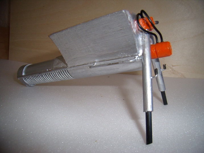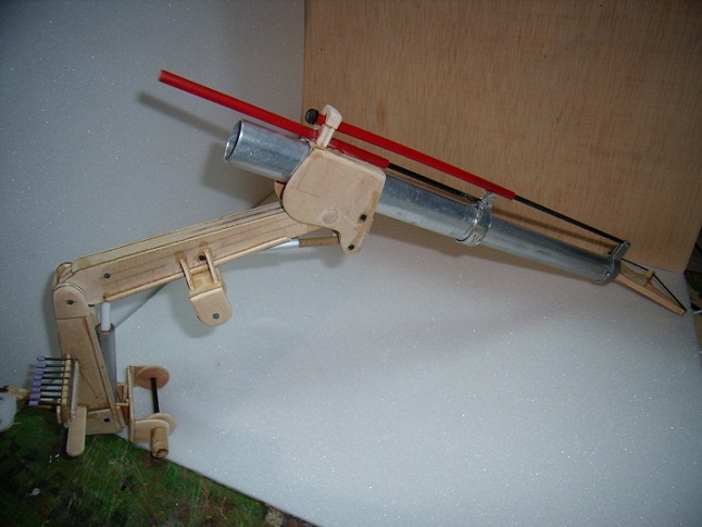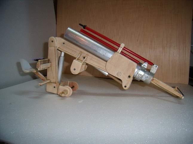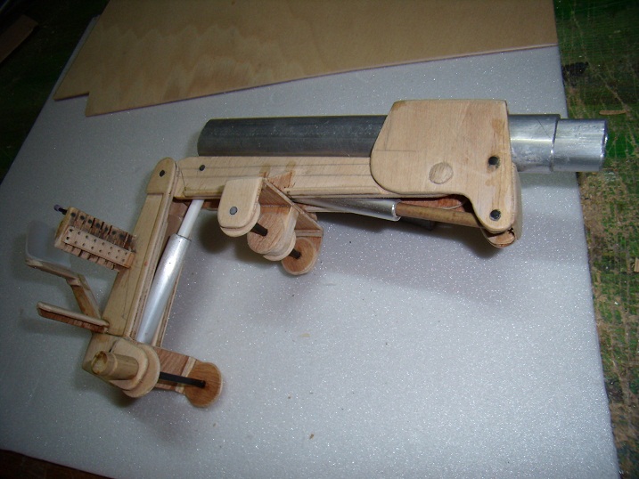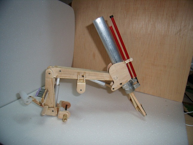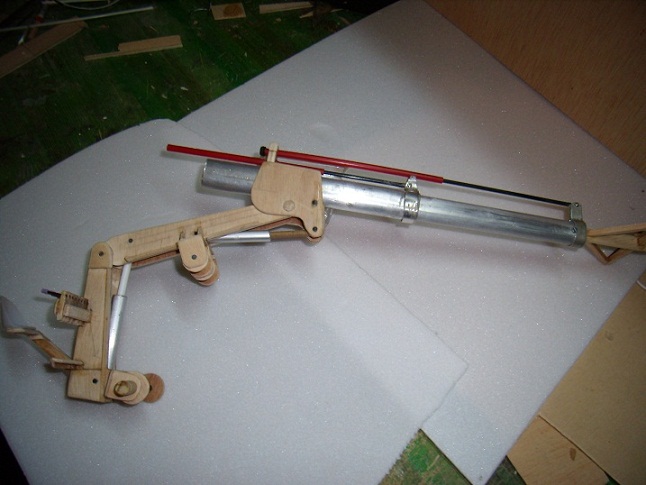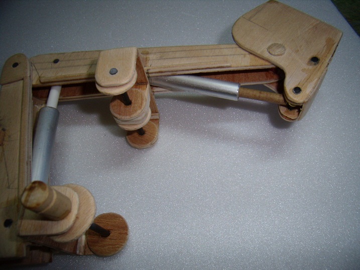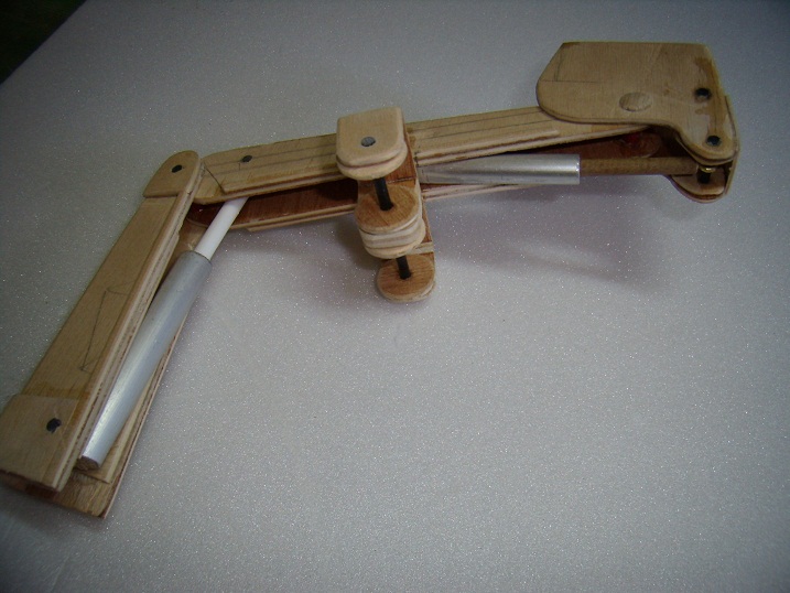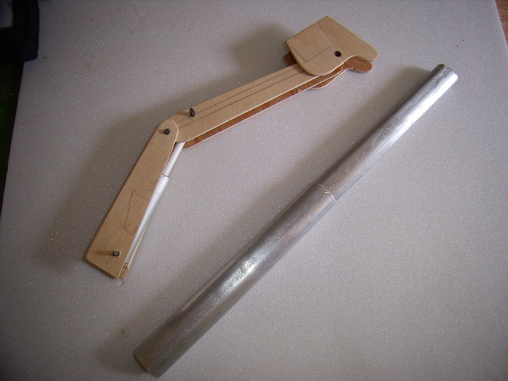 El cuerpo de la grua es de madera y la parte extensible , la hice con tubos de aluminio , uno entra dentro del otro y aplastados en el tornillo del banco