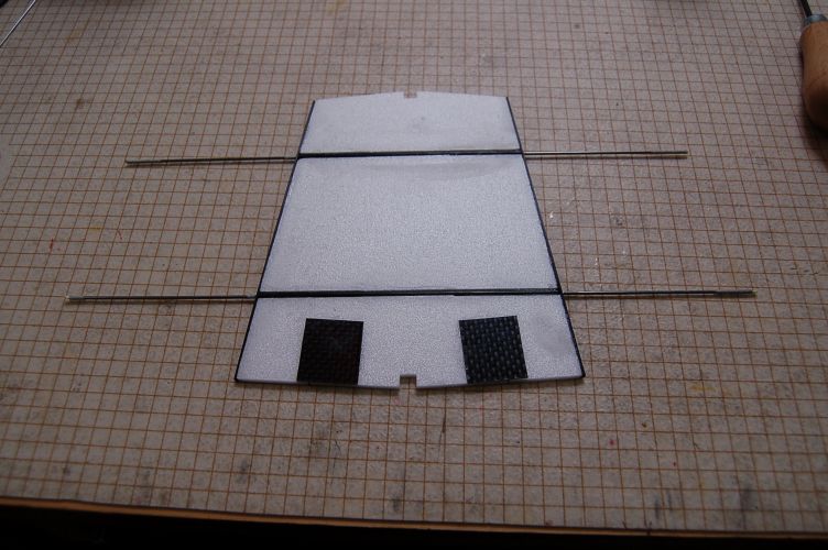 Parte central casi acabada, con los tubos de 3mm, tapetas laterales de carbono de 3x1mm, y varillas de acero de 1.5, embutidas y fijadas en los tubos.