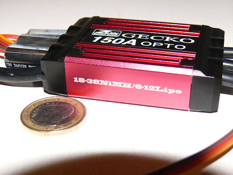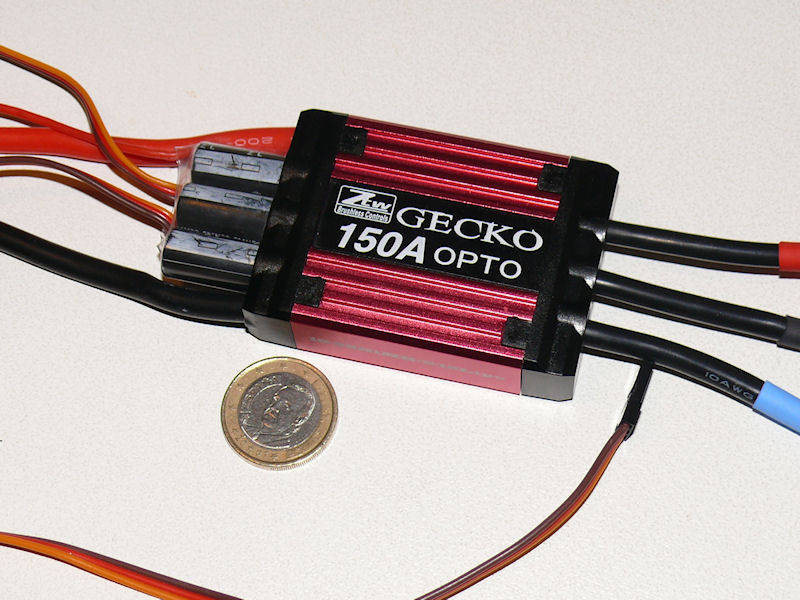 el variador por un modelo OPTO, ya que al ser todos los servos HV no teníamos necesidad de montar un S-BEC. El modelo seleccionado es el ZTW Gecko 150A/180A HV, un variador HV con características más que interesantes y a un precio muy competitivo, como un sistema de protección de sobre-calentamiento que no corta el motor, si no que reduce las revoluciones hasta conseguir enfriarse, evitando el susto y el más que posible "aporrizaje". Lleva un governor bastante avanzado e incluye "data-logger", con lo que podemos pasar los registros del vuelo al PC. Se puede programar mediante una "program box" y con los "pitidillos" de siempre. Incluye un detalle curioso : tiene dos conectores, uno para conectar al receptor, y otro para conectar al "program box", de forma que no tenemos que andar desconectando como en otras marcas. También lleva ya incluido el cable "anti-chispazo".