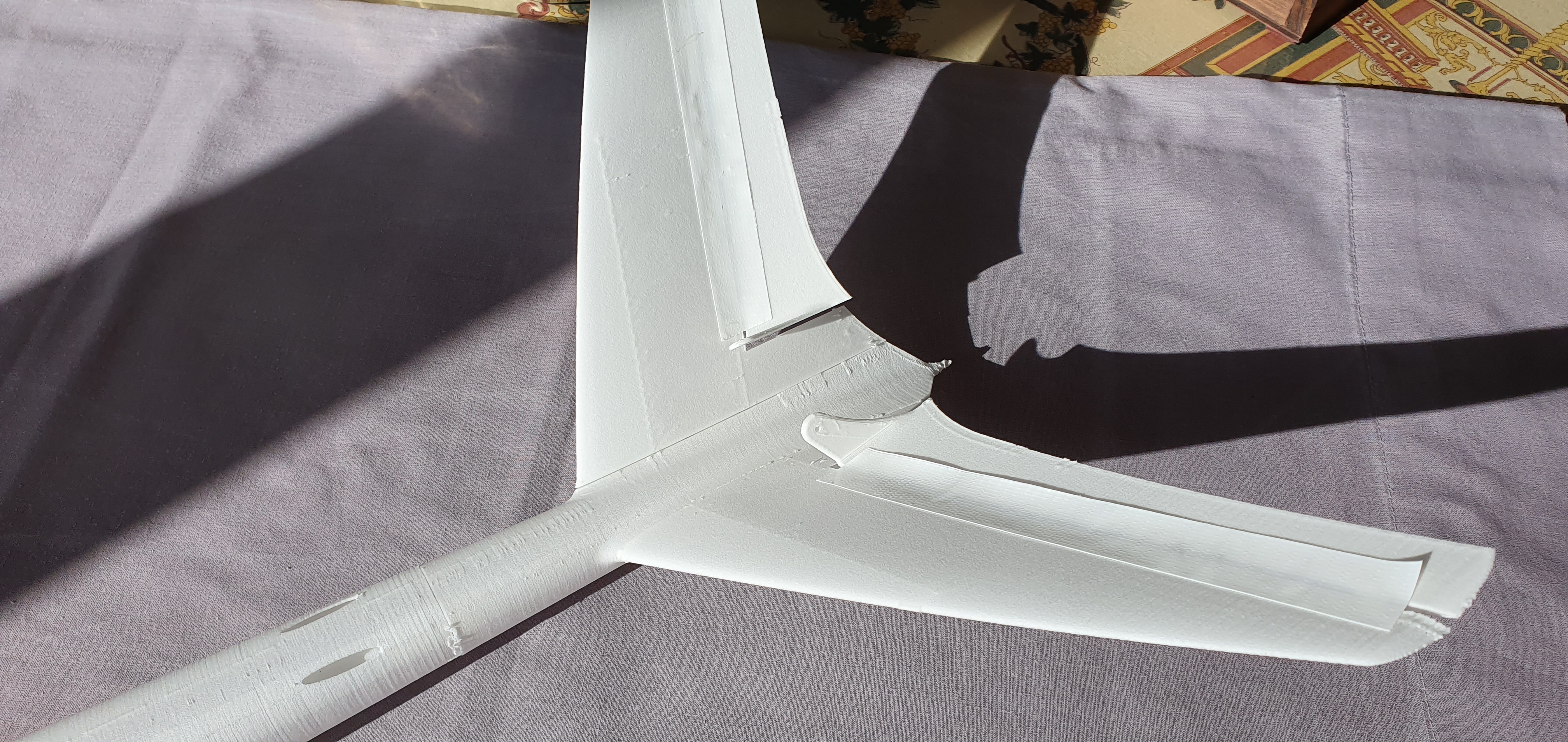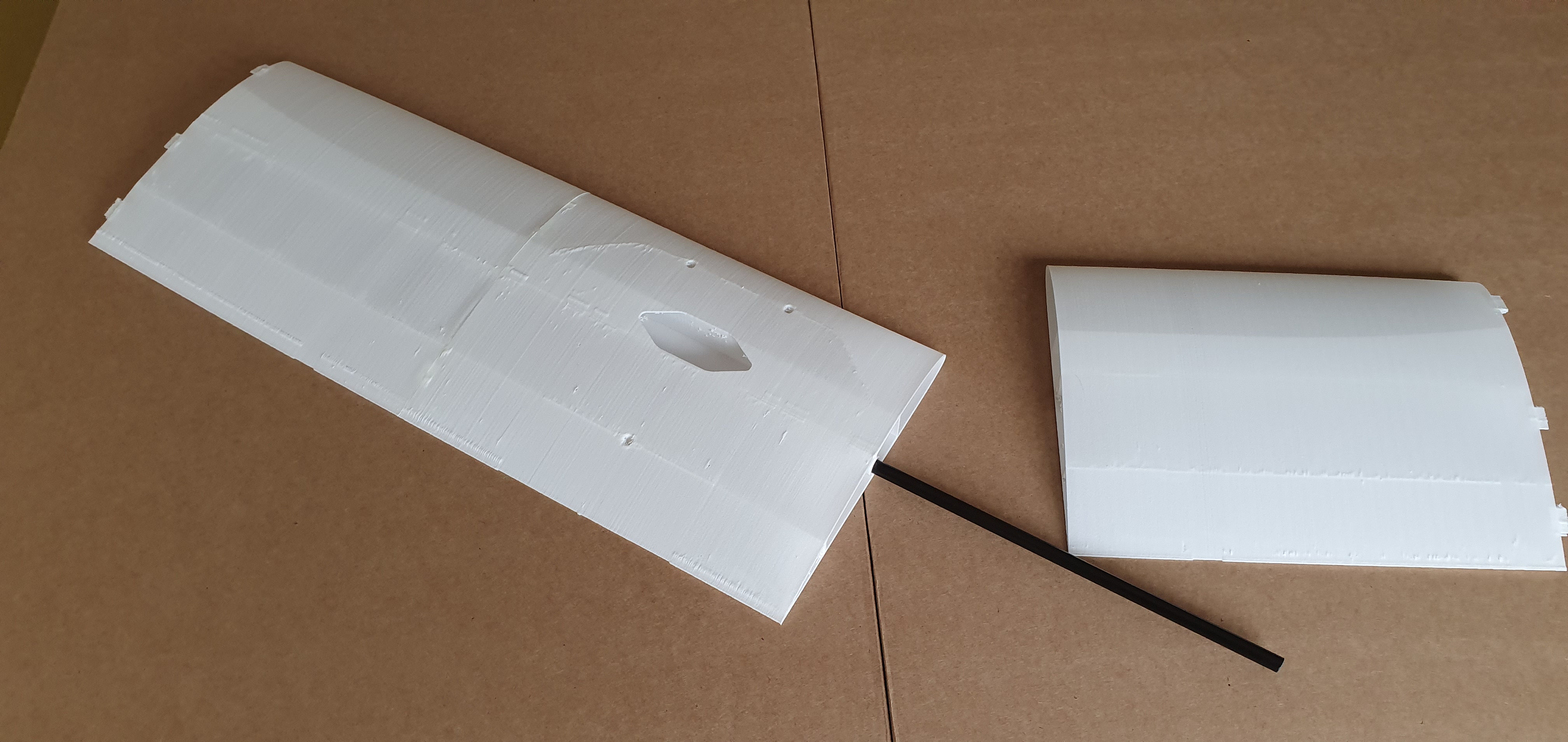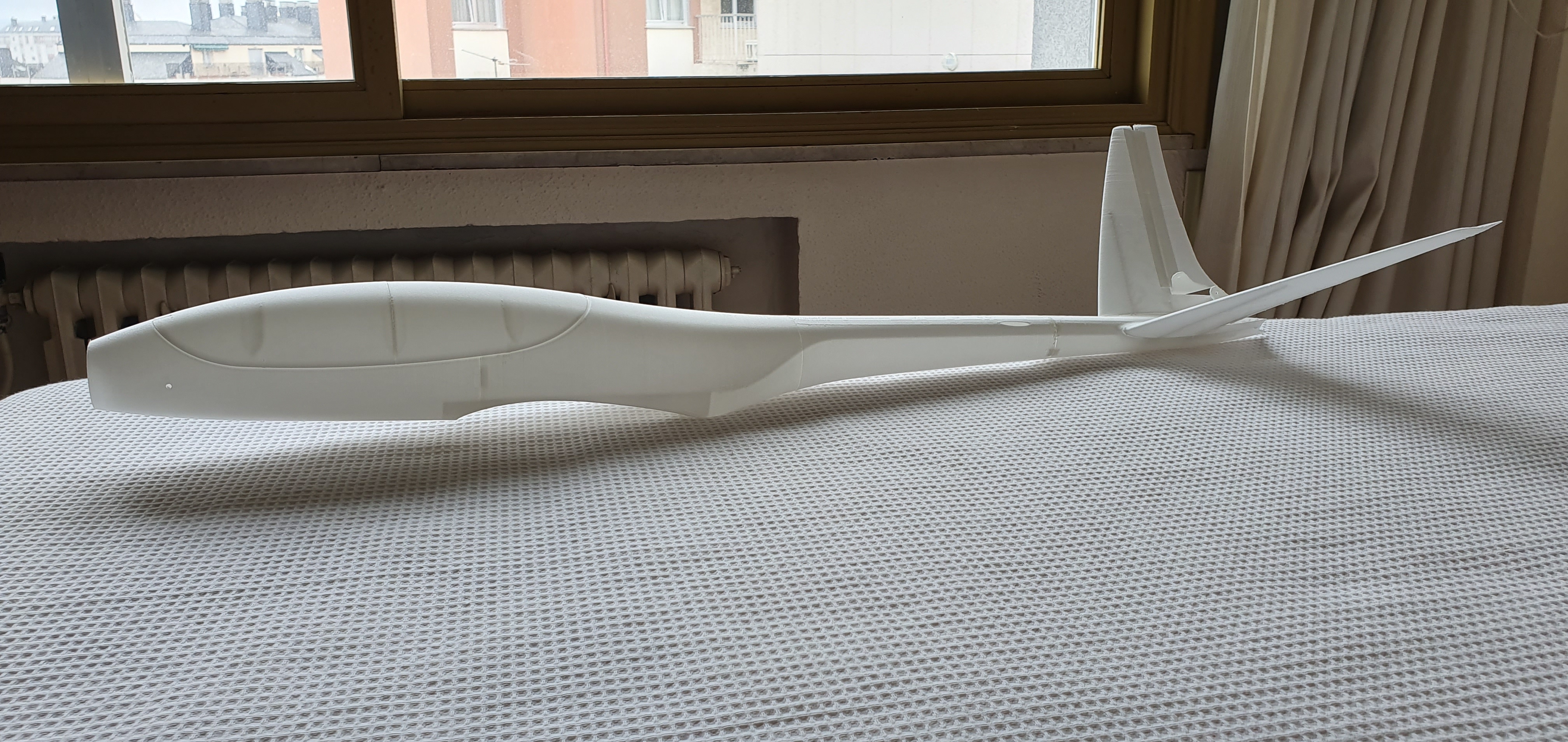 Os dejo un par de imágenes de un nuevo prototipo (se presentará en breve) diseñado específicamente para este material. Una de las secciones del ala para poder apreciar el acabado de la superficie (al tacto es como el antiguo papel de seda de entelar) y el ala completa sin ensamblar aun, llevará un tubo de carbono de 6 mm. como bayoneta. El ala que se ve en la imagen, con una envergadura de 140 cm, pesa sólo 84 gramos.