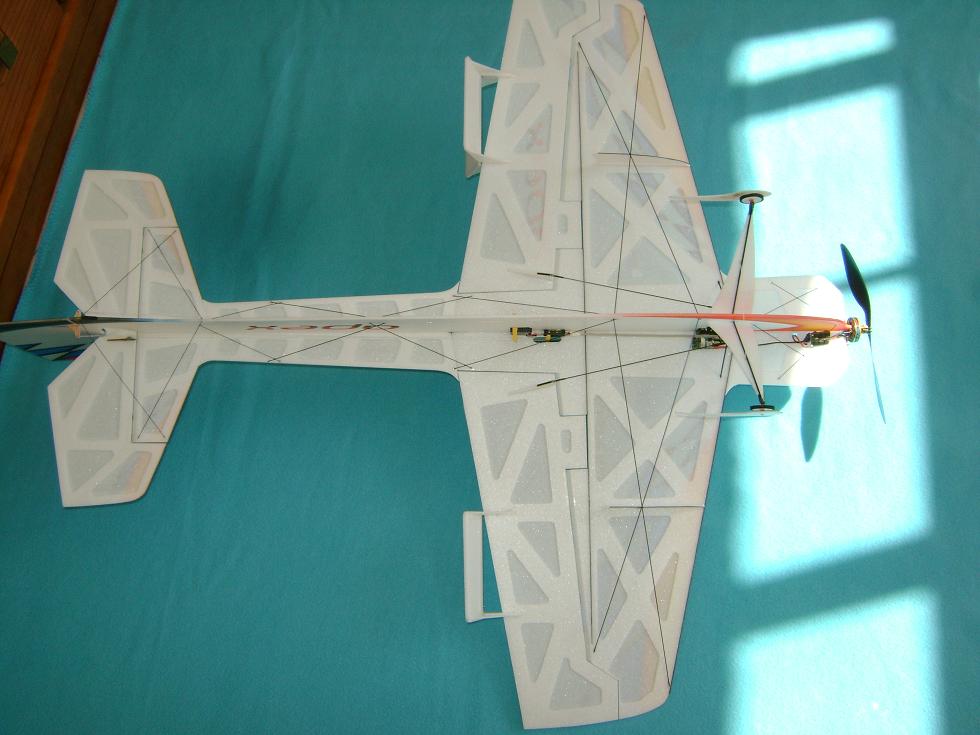Para destacar puedo comentarles que la actitud del modelo en vuelo es mas neutra, muestra una firme sustentacion con un minimo angulo de ataque, haciendo las transiciones de vuelo normal a cuchillo mucho mas faciles, el vuelo invertido es muy estable porque esta dotado de un fuerte diedro en el ala que se coloco en el tren principal, el vuelo a cuchillo apenas requiere de aplicacion de direccion, y no muestra tendencia alguna en esta posicion. La salida de las figuras en descenso es limpia, sin cambios de actitud bruscos y con trazadas consistentes, gracias tambien a un muy efectivo freno desarrollado con un angulo de 70º que permite aumentar la superfice del mismo sin restar precision en el mando de alerones que es donde va colocado. Los alerones cuentan con doble compensador aerodinamico para poder efectuar el medio giro antitorque con garantias sin forzar el servo.