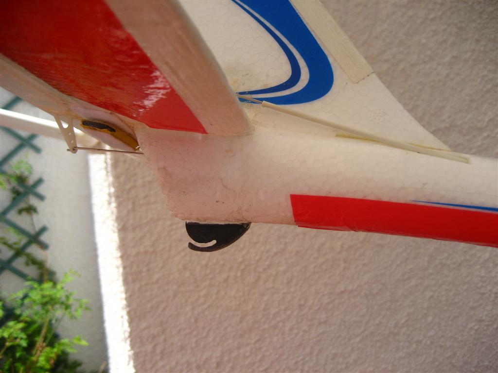 Y, para rematar, y que no me suceda lo que a tí te ha pasado en el estabilizador de cola, le he metido - haciendo un surco- una varilla de fibra de carbono de 3 mm de punta a punta, pegada con cola. No hago foto porque no se ve, ya que lleva encima una cinta americana y la cinta roja también.
