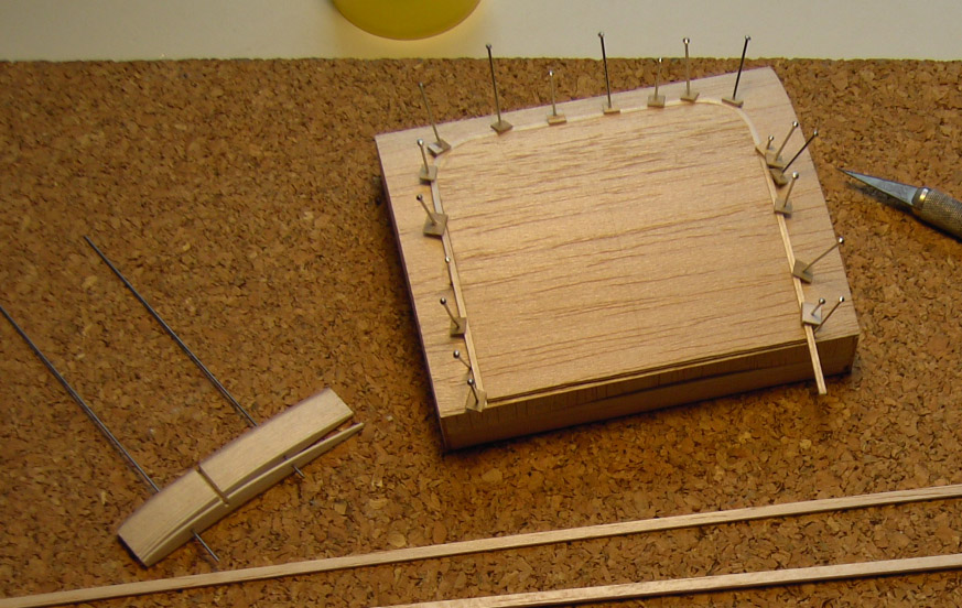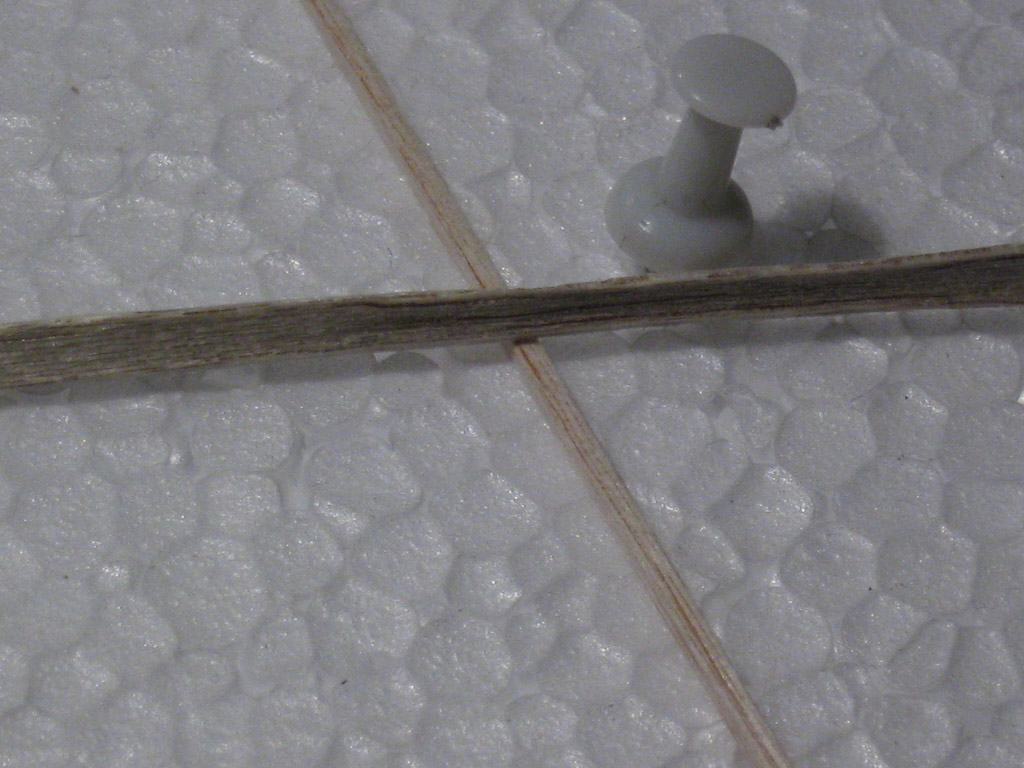 Aqui no se aprecian bien, pero las tres laminillas estan ya pegadas y sujetas con alfileres con trocitos de madera para que se mantenga la forma. (Ahora no recuerdo bien, pero es posible que usara sólo dos laminillas). La sección final era de 1,5x1,5mm.