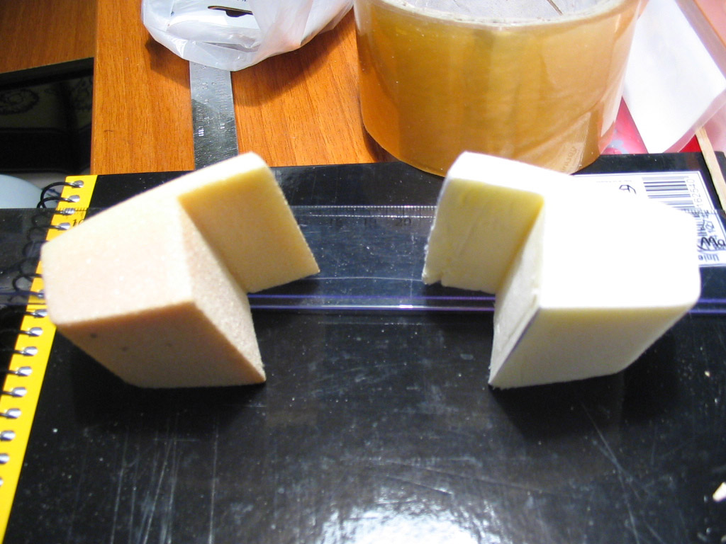 - Poliuretano (izda de fotos 1 y 2 y foto 3): es muy duro y rígido, con la burbuja muy fina, por lo que se hace fácil de trabajar con sierra dando menos errores en los cortes rectos y cualquier error tiene menos importancia por que no te pasas mucho. Se puede alisar con lija gruesa (60 o así), pero trabajosamente y además deja poros abiertos de las burbujas. Resulta muy resistente, pero la pieza pesa 5,3 gr.