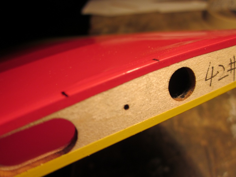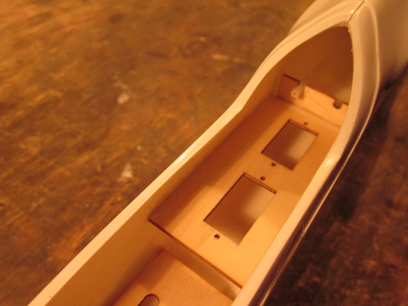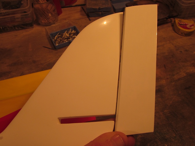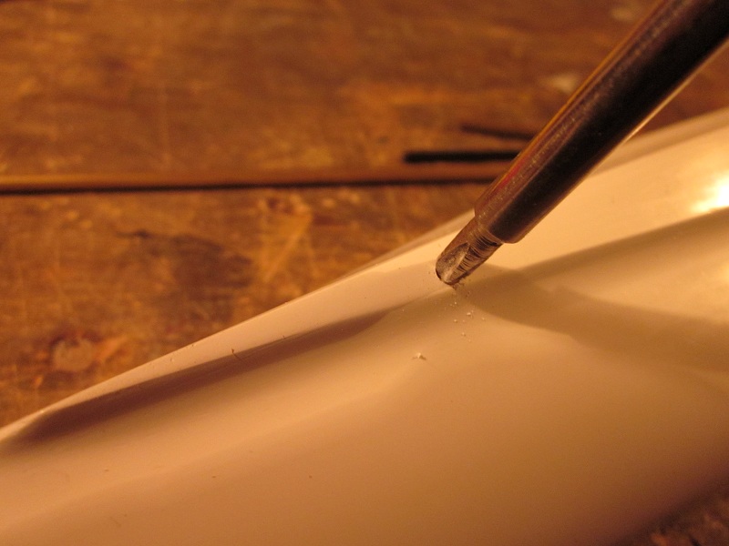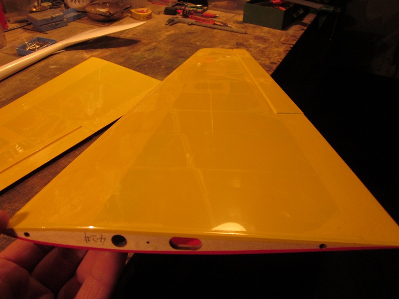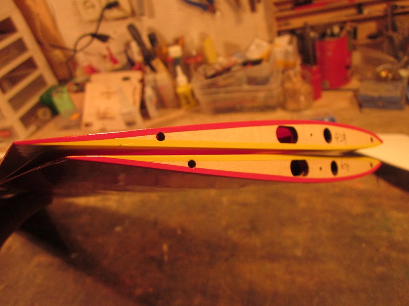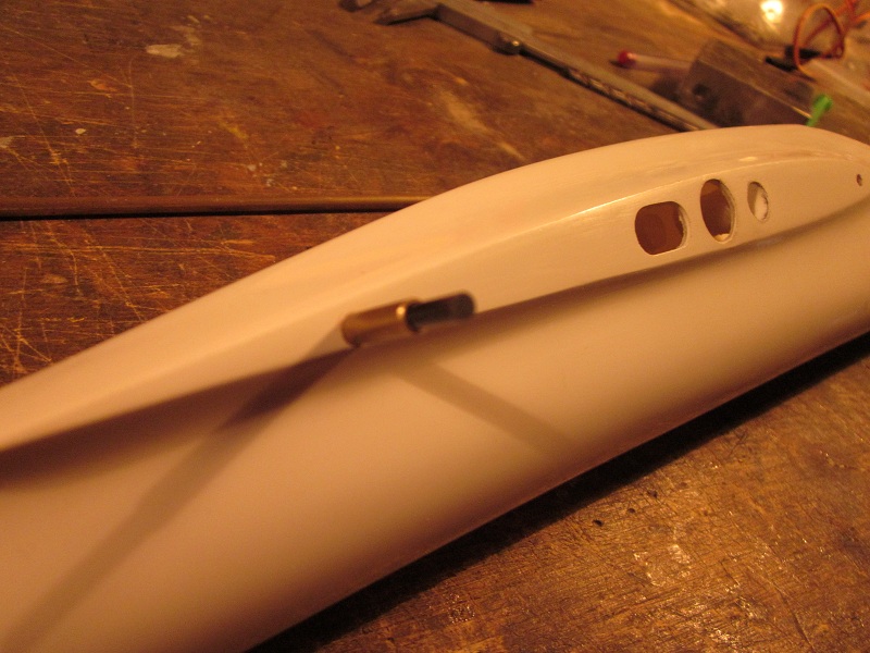 Esta es la modificación que yo personalmente le e echo a los pasantes de los tetones que unirán el ala al fuselaje, estos son dos de 3mm, uno es de carbono y el otro de fibra, para que no quedasen con el tiempo holgados pues el grosor del fuselaje en ese punto no supera los 2mm, lo que e echo a sido pegarle por dentro del fuselaje dos casquillos de latón de la misma medida del ancho del fuselaje,y de 3mm interior y 4mm exterior, para ello e tenido que dimensionar los orificios de 3mm a 4mm de la medida de los casquillos, y como veis me a servido para dimensionarlos la misma punta del destornillador, ( justo tiene 4mm )lo peor del asunto este, es pegar el que va en la parte trasera, pues queda muy atrás, para pegarlo utilice un palillo de madera de los que se usan para hacer brochetas, así con el palillo pude alcanzar para dejarle caer el pegamento al casquillo y al fuselaje, esta claro que sin paciencia no hay ciencia, :lol: una vez resuelto y para no estar siempre poniendo y quitando los tetones los deje pegados y bien centrados a los casquillos,con una pequeña gota de ciano, y la verdad que una vez probado , poniéndole las alas a quedado perfecto, :D