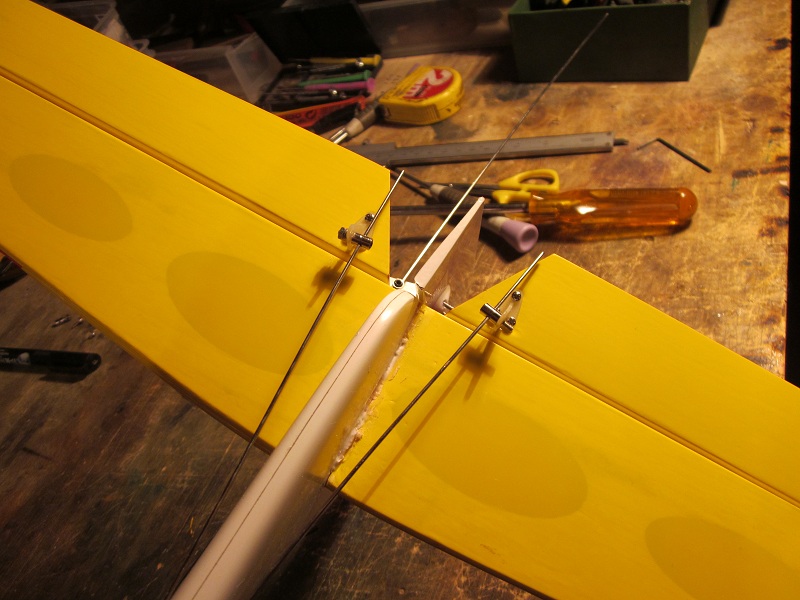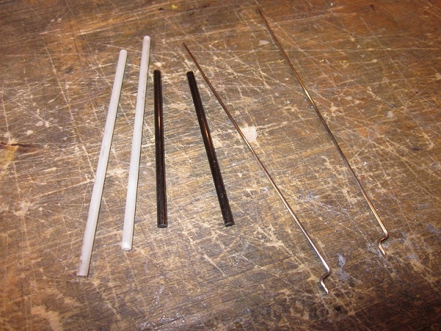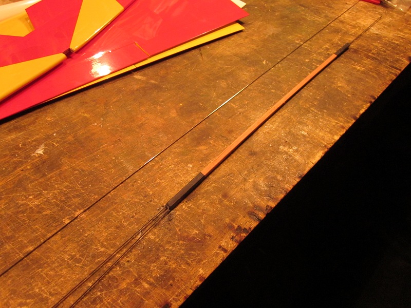 Yo cambiaría esas varillas por este sistema de transmisión http://www.aeromodelismoserpa.com/micro ... -2218.html la varilla es de acero de 1,5mm y trae los prisioneros para los servos solo hay que hacer el dobléz en Z. Lo normal es hacer un par piezas (inclusive un larguero de 3mm x el ancho interno del fuselaje te sirve) con la forma interna del fuselaje, una la colocas a la altura del borde de ataque y la otra a la altura del borde de fuga con epoxy, previamente házle 2 agujeros a cada una para pasar el macarrón externo y pégalas con epoxy a estos soportes y en la salida del fuselaje sin dejar holguras al macarrón, así no flectará la varilla de transmisión y con seguridad terminan siendo más livianas que las otras.
