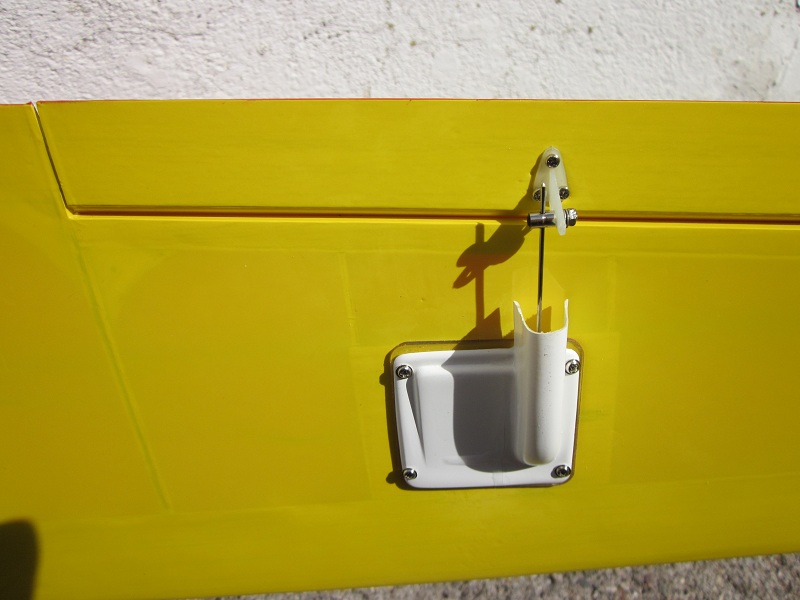 Otra modificación que le e echo, a sido en el sistema de retención de las alas al fuselaje, en el kit esto lo an solucionado, con un muelle que se engancha en 2 Cáncamos o alcayatas que se atornillan en el alma de las alas, a mi parecer este sistema aunque no dudo sea efectivo, me parece un tanto engorroso, y creo que con el paso del tiempo y de tanto quitar y poner el ala, los Cáncamos tenderán a coger holgura, bueno pues aquí muestro la chapuza que le e ideado, pero parece efectiva,