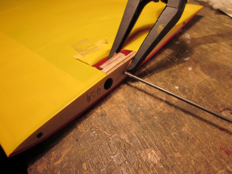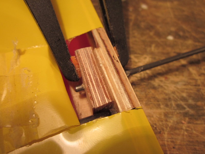 Una vez echas las piezas que anteriormente mostré, lo siguiente fue despegarle un poco el entelado por la parte del intradós del ala, taladrar el punto por donde pasara la varilla de 2mm y pegar las dos piezas bien centradas por la parte de dentro del perfil, una vez ya secas, volví a pegar el entelado, y le pegue un trozo de recubrimiento nuevo, con el fin de reforzar un poco esta zona, y de paso quedase un poco mas estético, el bloqueo se consigue con dos tornillos Allen 3mm. con acceso por el extrados, Bueno pues espero algún comentario, sobre la chapuza, :oops: a ver que os parece, acepto los comentarios, :mrgreen: Saludos…..