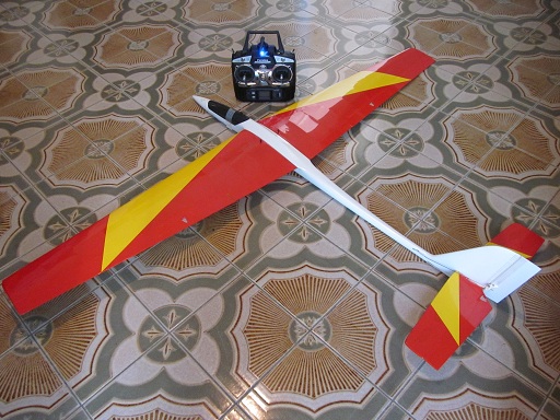 Bueno Alfredo vamos por partes…… el fuselaje desde el morro asta el final de los carmans del ala parece ser, que tienen cierta fortaleza , pero no pienso igual a partir de ay y asta la cola, :?: no parece de fibra sino de plástico, quizás me equivoque pero esa es my sensación al tacto, el espacio que trae para poner el empenaje horizontal en la cola , me a venido con una tara, :oops: cuando me dispuse a pegarlo me di cuenta de que no viene paralelo sino al bies, vamos que para dejarlo en su sitio e tenido que calzarlo abajo en un lado y arriba en el otro, vamos toda una chapuza , pero bueno ay a quedado bastante bien, no sin esfuerzo por mi parte, :x en la unión de las alas todo esta correcto, si as leído mi primer post, explico unas modificaciones que le e echo a los orificios en el fuselaje por donde pasan estos, poniéndoles unos casquillos de latón , pues sin ellos las alas en ese punto tienden a bailar, otra cosa y con respecto al ala, y como tengo una suerte bárbara, :( es que una de las semialas, me a venido un poco combada, no es mucho pero mirándola en su longitud se advierte, espero en vuelo no tenga vicio. :?: Otro punto que no me a gustado es el mando de profundidad , este como abras visto en el video, es un listón de no se que madera, con una línea metálica hacia el servo y en el otro extremo dos hacia los timones, pues cuando le das mando comba que se las pela, :( tendré que mejorarlo, pues no me gusta nada, respecto al C.G e decidido empezar a hacerle unas pruebas a 80 mm del borde de ataque, y para conseguirlo en ese punto me a pedido en todo lo mas adelante del morro , 116 gramos de plomo y a continuación 50 gramos mas de la batería 4 acumuladores 1000 mAh. AAA, PUES NO ENTRAN OTRO TIPO