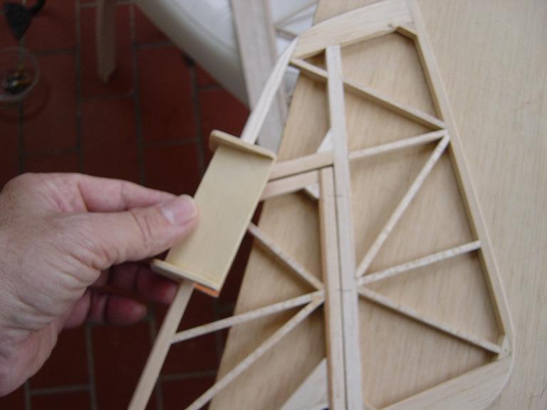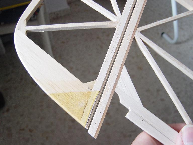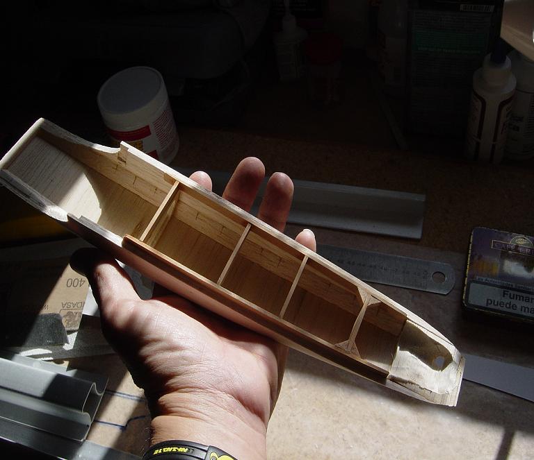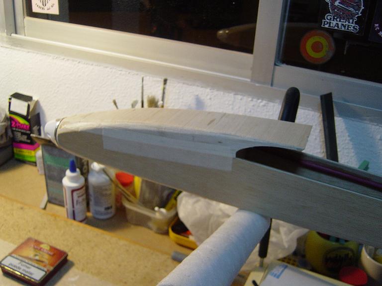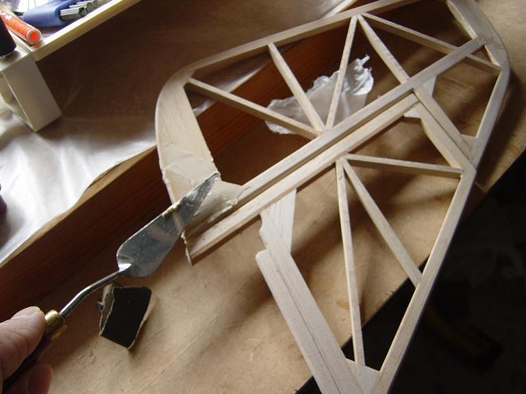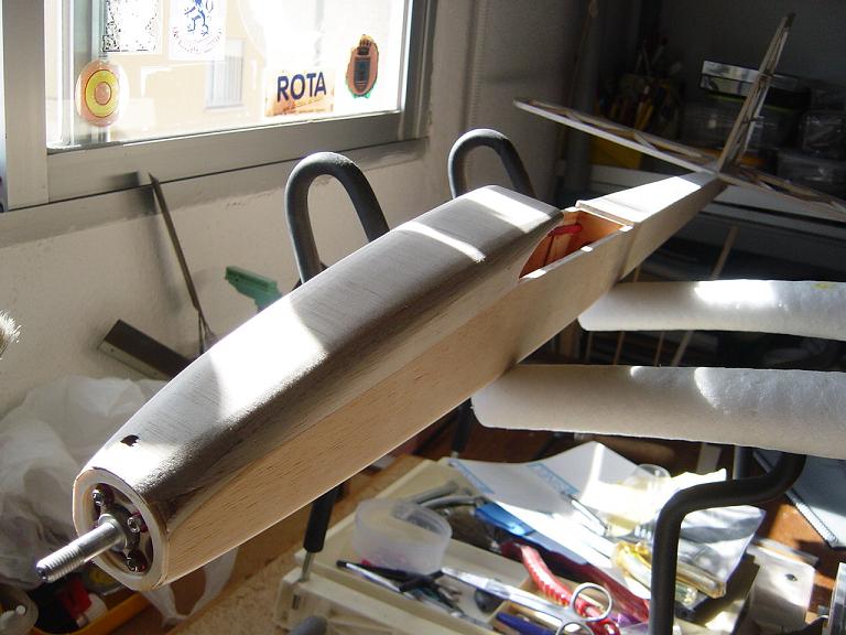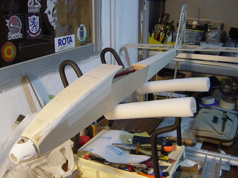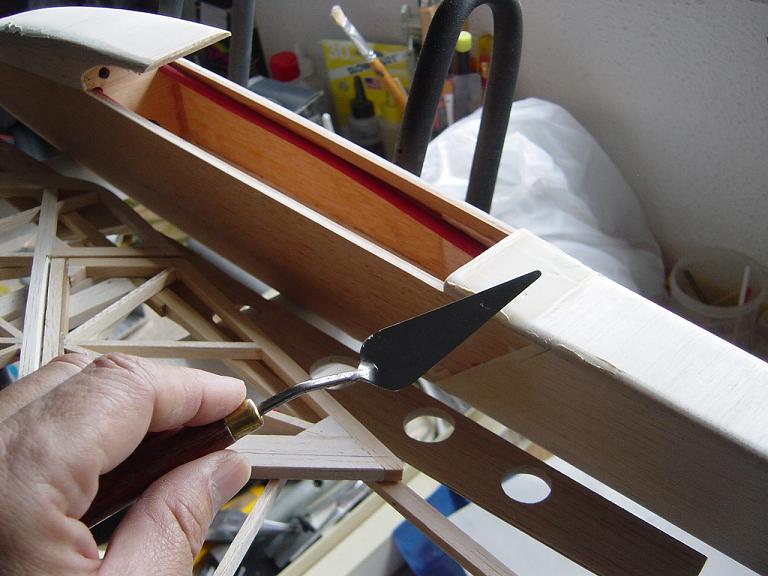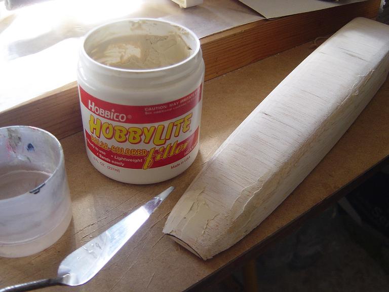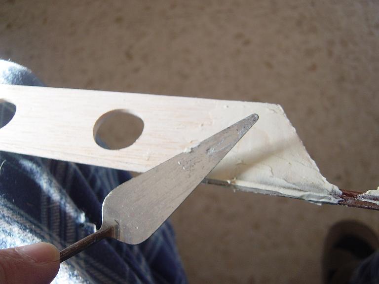 Hemos empezado ya el lijado en primer lugar del fuselaje, vamos debastando las esquinas y utilizamos para ello diferentes tacos de lija de grano 60, 120 y 220 de momento, aunque en el lijado final usaremos granos 400 y 600. El agujero que se nos formó en el ahuecado de la cabina para dejar paso a los cables del motor lo tapamos con tela de fibra de vidrio y ya nos extendemos por toda la zona para que sirva de refuerzo. Pegamos la tela interiormente con ciano fluido y por fuera utilizamos masilla de relleno de la Hobbico denominada Hobbylite del mismo color que la madera que aplicamos con una espátula. Un buen truquillo para que la masilla de relleno se adhiera mejor a la madera es humedecer previamente el area de aplicación con la yema de los dedos mojados en unas gotas de agua... La masilla la aplicamos con una espátula de las utilizadas en bellas artes..