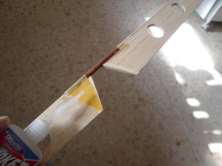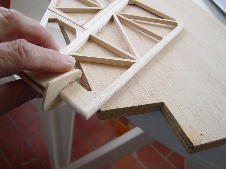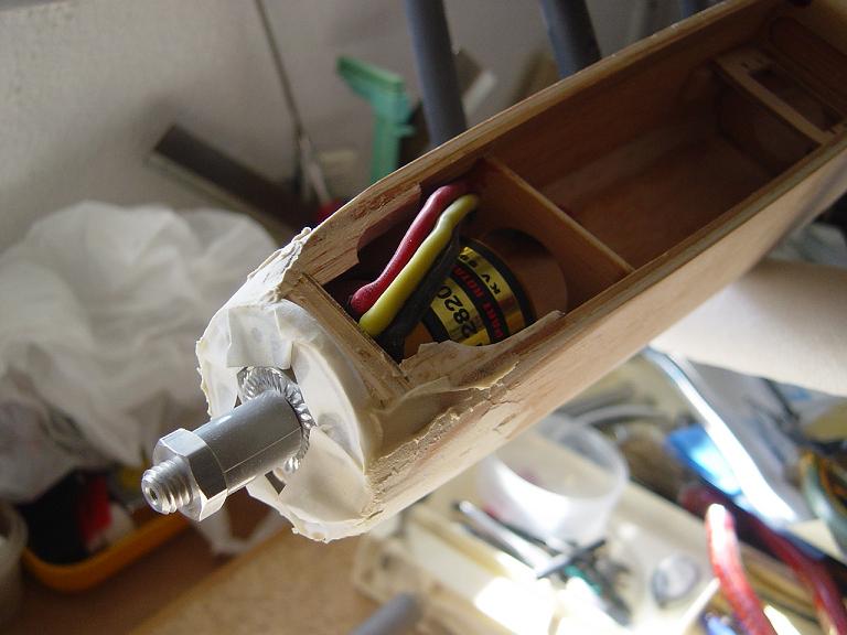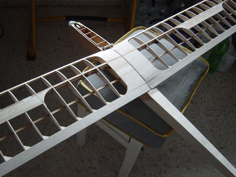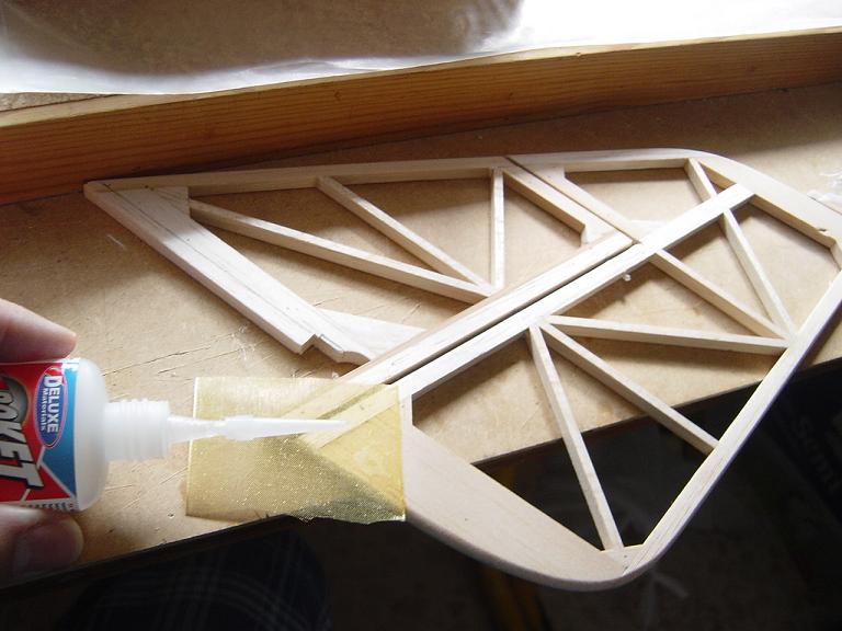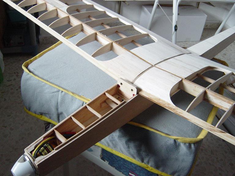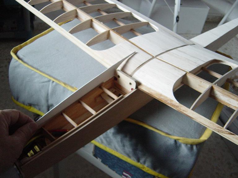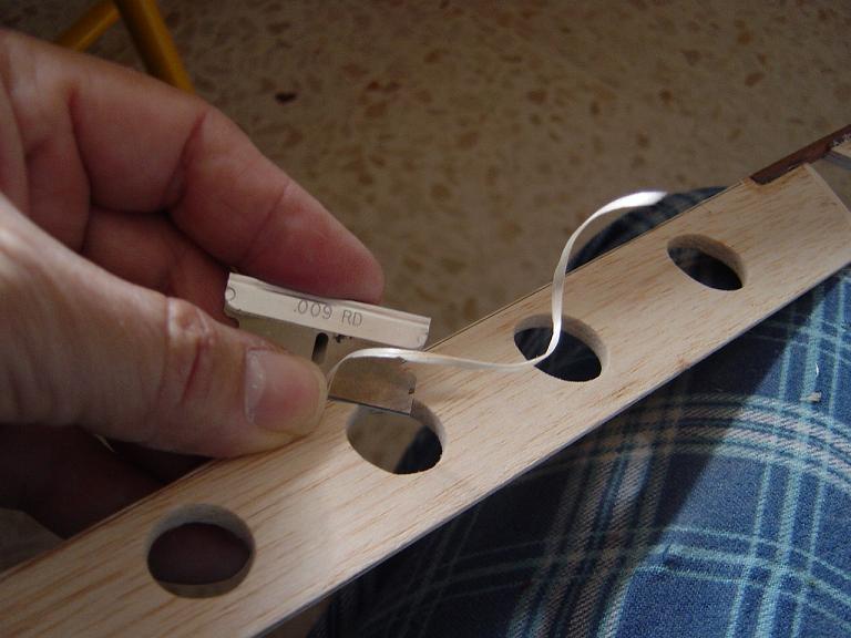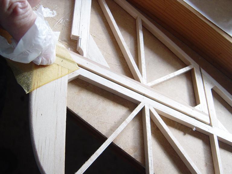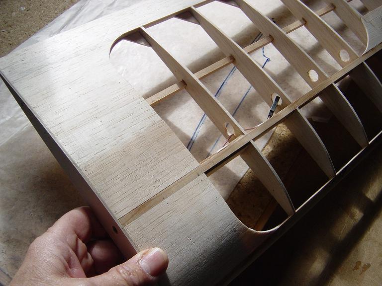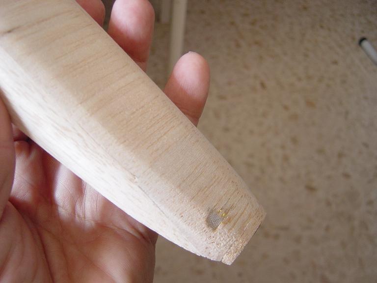 Hemos empezado ya el lijado en primer lugar del fuselaje, vamos debastando las esquinas y utilizamos para ello diferentes tacos de lija de grano 60, 120 y 220 de momento, aunque en el lijado final usaremos granos 400 y 600. El agujero que se nos formó en el ahuecado de la cabina para dejar paso a los cables del motor lo tapamos con tela de fibra de vidrio y ya nos extendemos por toda la zona para que sirva de refuerzo. Pegamos la tela interiormente con ciano fluido y por fuera utilizamos masilla de relleno de la Hobbico denominada Hobbylite del mismo color que la madera que aplicamos con una espátula. Un buen truquillo para que la masilla de relleno se adhiera mejor a la madera es humedecer previamente el area de aplicación con la yema de los dedos mojados en unas gotas de agua... La masilla la aplicamos con una espátula de las utilizadas en bellas artes..