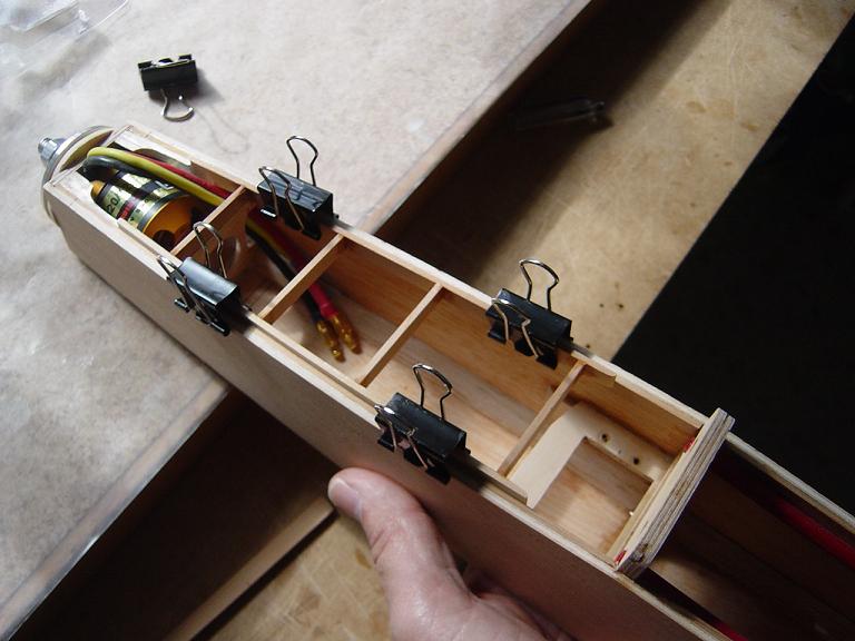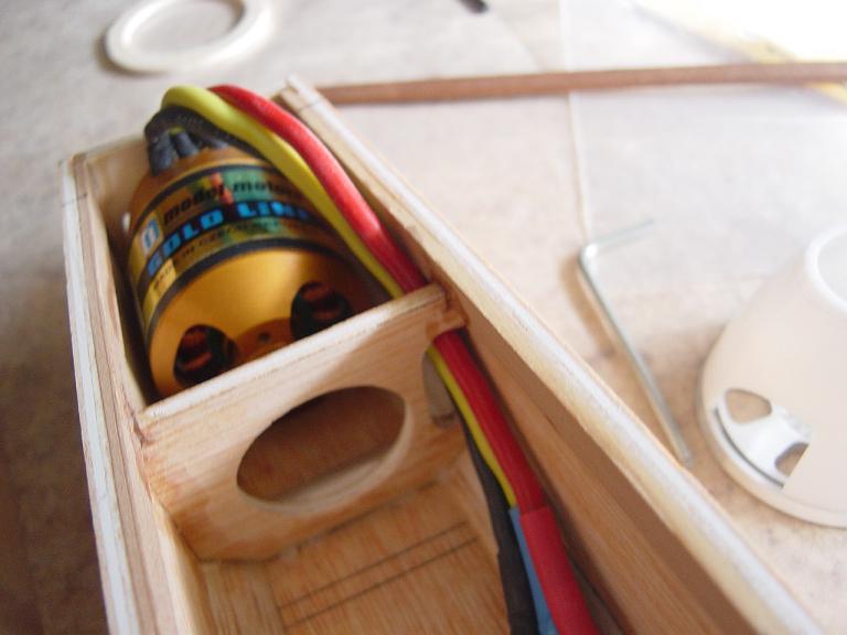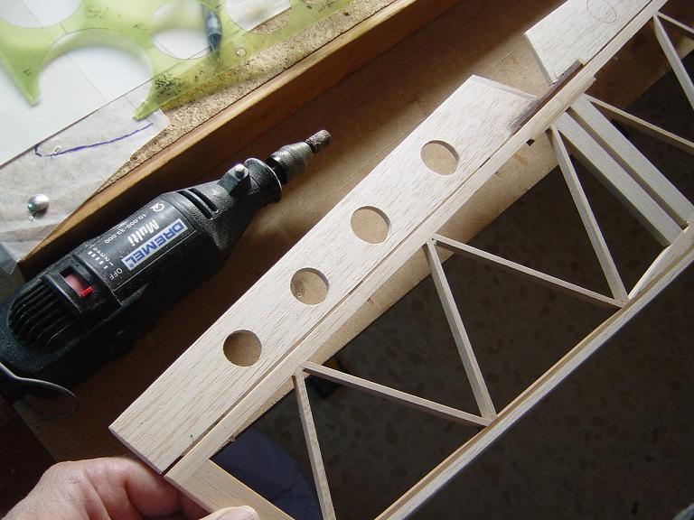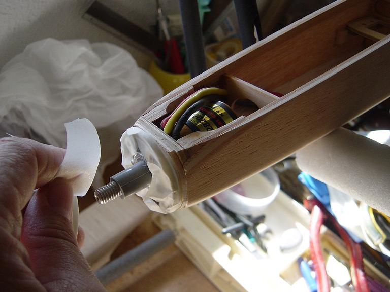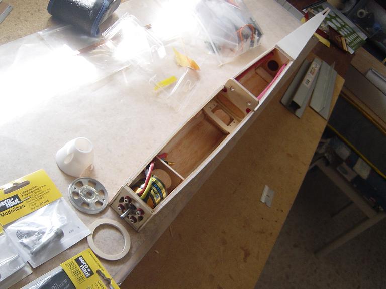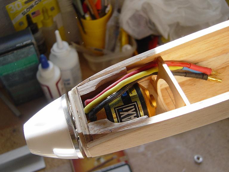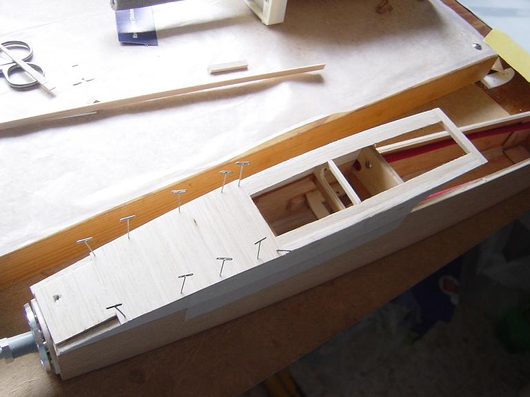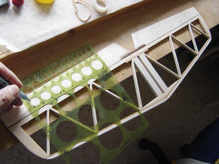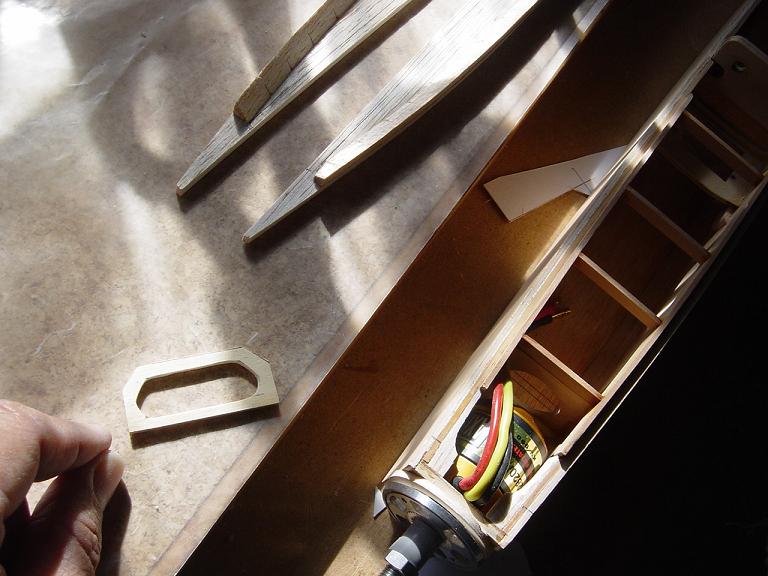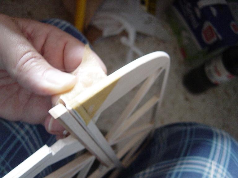 Hemos empezado ya el lijado en primer lugar del fuselaje, vamos debastando las esquinas y utilizamos para ello diferentes tacos de lija de grano 60, 120 y 220 de momento, aunque en el lijado final usaremos granos 400 y 600. El agujero que se nos formó en el ahuecado de la cabina para dejar paso a los cables del motor lo tapamos con tela de fibra de vidrio y ya nos extendemos por toda la zona para que sirva de refuerzo. Pegamos la tela interiormente con ciano fluido y por fuera utilizamos masilla de relleno de la Hobbico denominada Hobbylite del mismo color que la madera que aplicamos con una espátula. Un buen truquillo para que la masilla de relleno se adhiera mejor a la madera es humedecer previamente el area de aplicación con la yema de los dedos mojados en unas gotas de agua... La masilla la aplicamos con una espátula de las utilizadas en bellas artes..