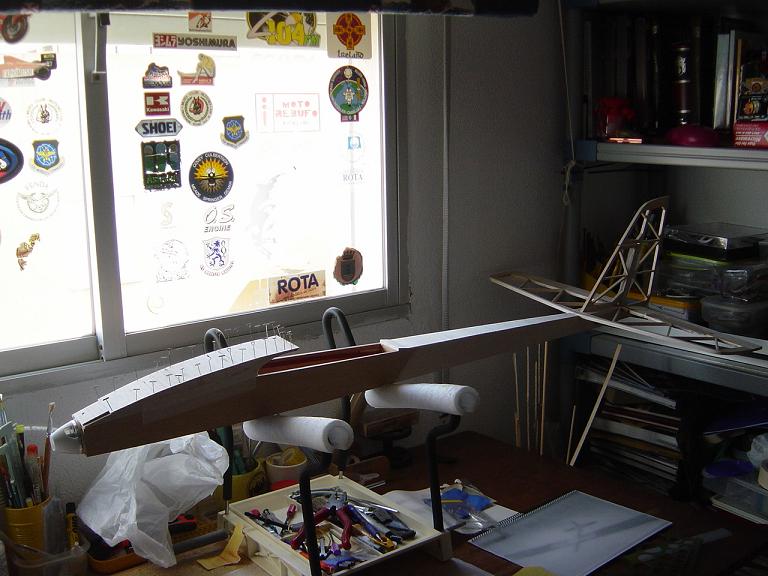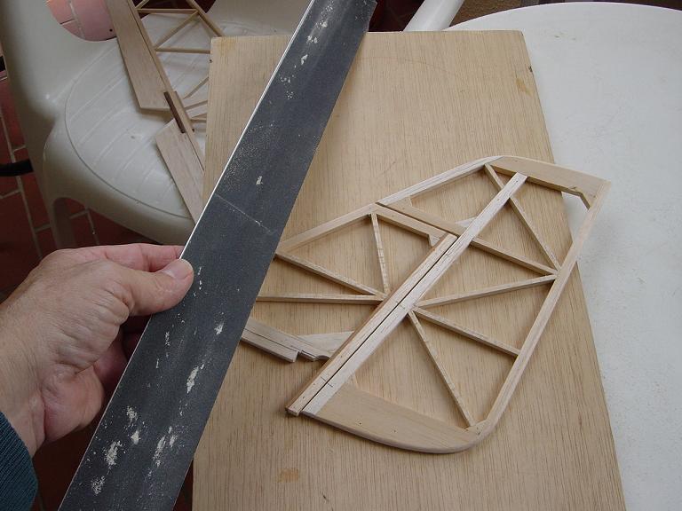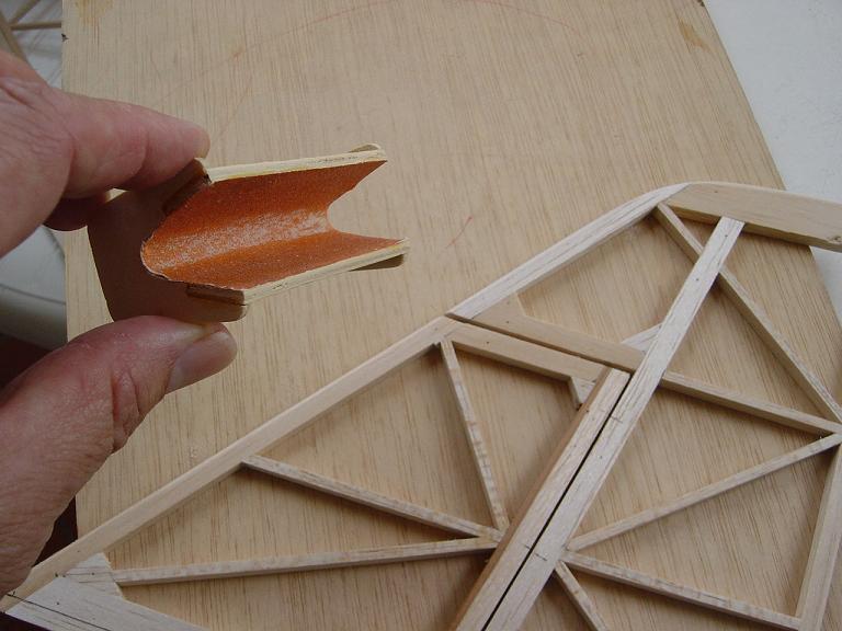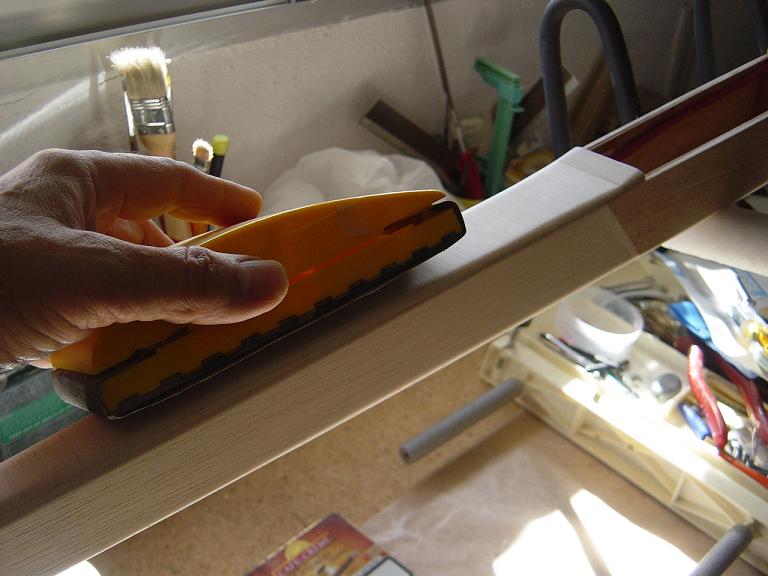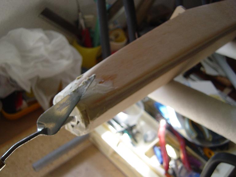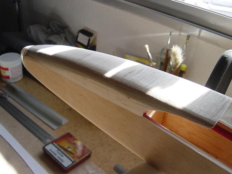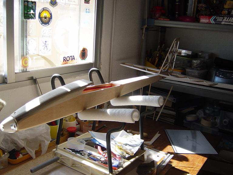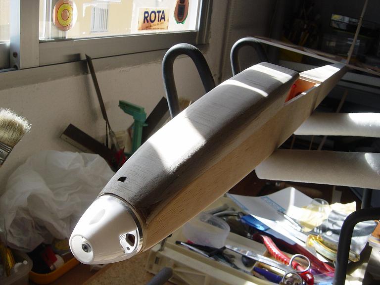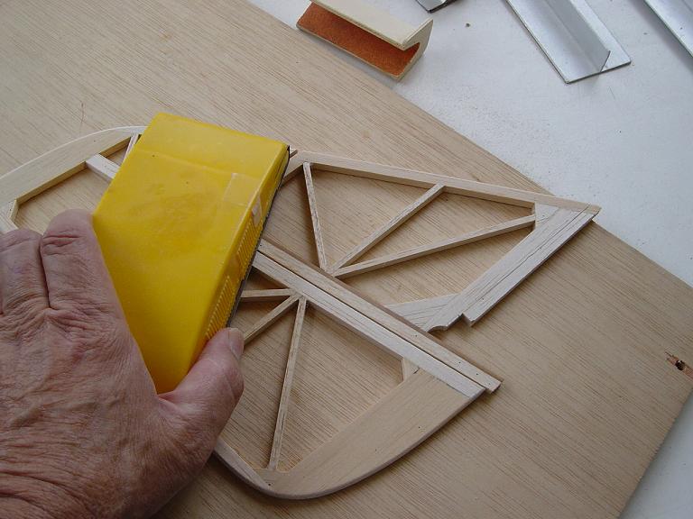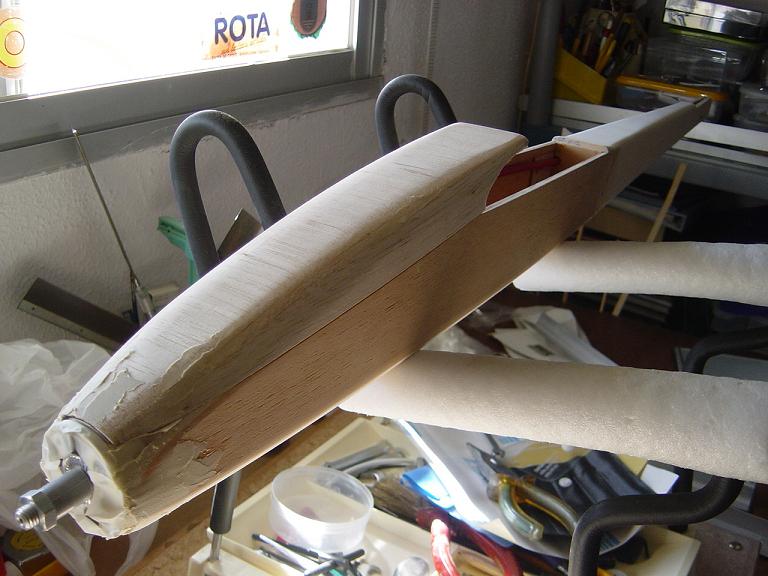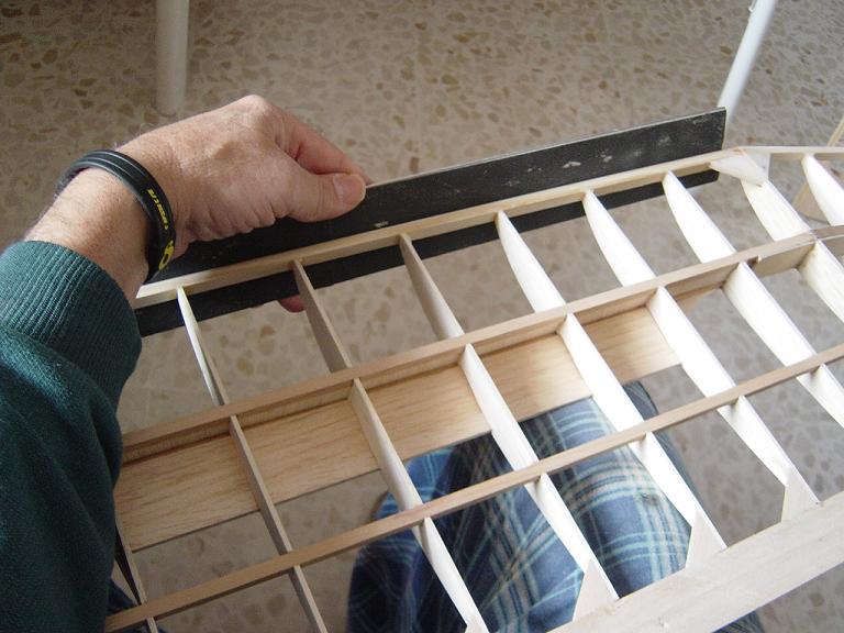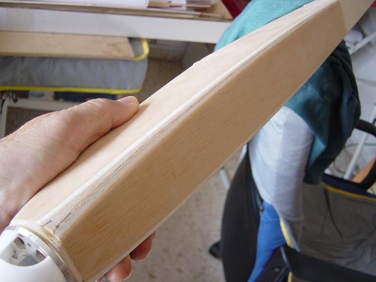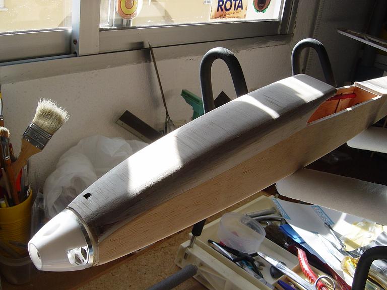 .... y el primer paso en una terminación aceptable al menos empiza por una buena fase de lijado, enmasillado, vuelta a lijar, etc. Este proceso es aún más importante si cabe en terminaciones con plasticos termorretractiles. En este sentido hemos de considerar el film de recubrimiento como la última capa de pintura que le fuesemos a dar al modelo. Esas décimas de milímetro que hay entre la vista y la madera formado por el grosor del termorretractil es lo que cubre el trabajo de la madera; esta una vez recubierta, será practicamente el producto final. Cualquier protuberancia, mal lijado, incluso motas de polvo que queden atrapadas entre la capa del plastico termorretracil y la madera, parecerán luego " montañas " y resaltes indeseables que mermarán el acabado del modelo... y eso sin contar la eficiencia aerodinámica que reviste una mayor importancia en los veleros.