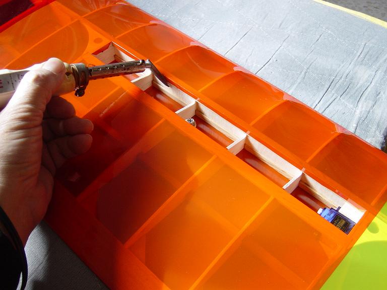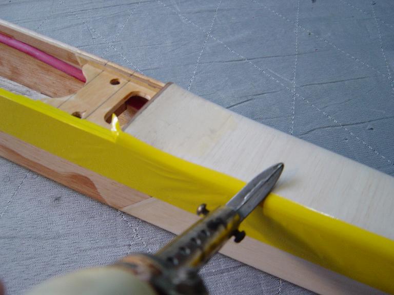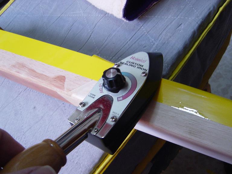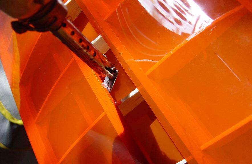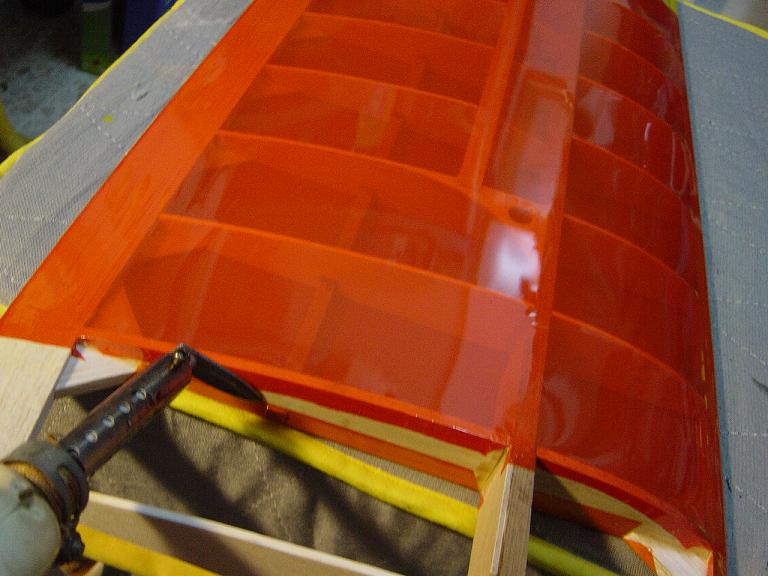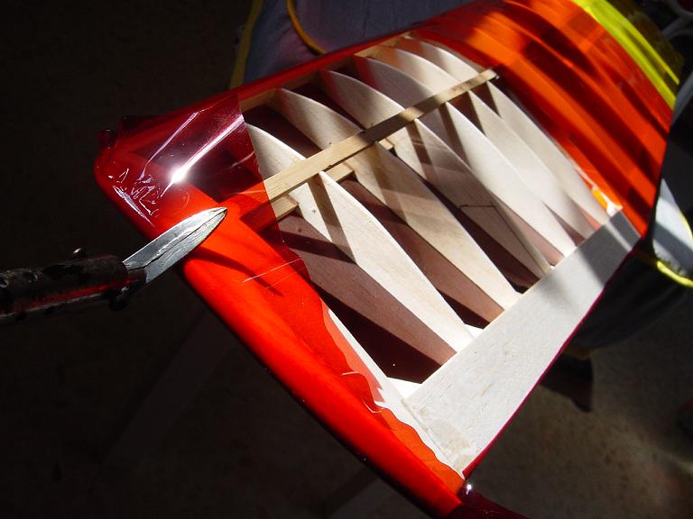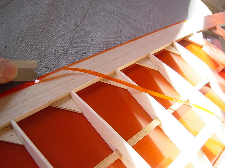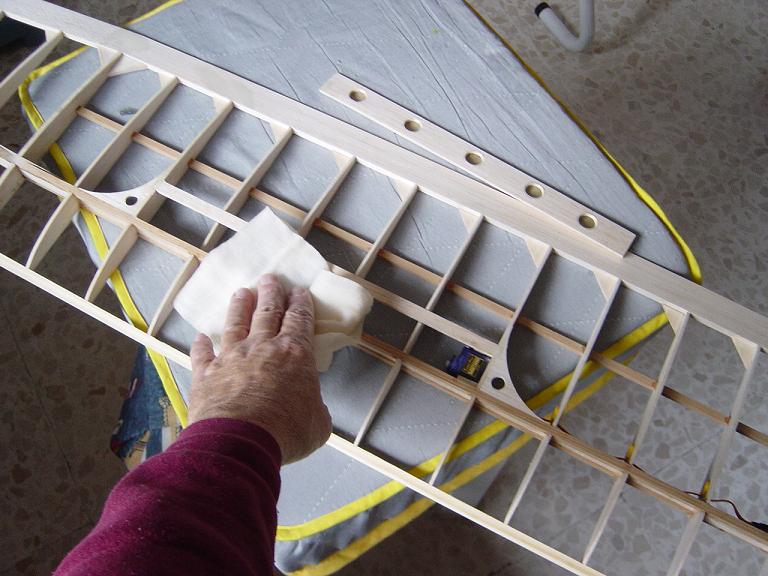Aquí como en los estabilizadores es conveniente dejar un solapado aunque ahora debe de ser un poco mayor, unos cinco milímetros o así que pegaremos al interior de las costillas y largueros a fin de que el recubrimiento tengo mas agarre. Solo tensamos de momento en los alrededores y no procedemos al tensado total y chequeo del ala para que este bien plano y sin reviraduras hasta que la tengamos totalmente entelada.