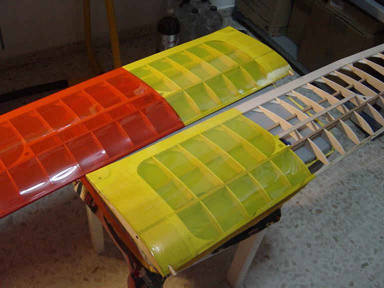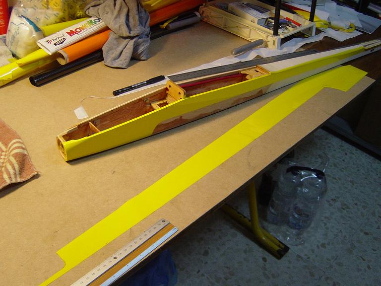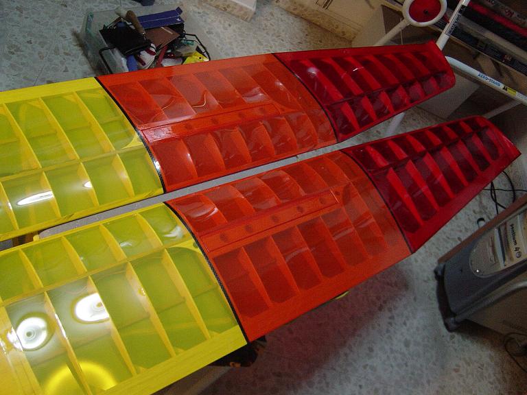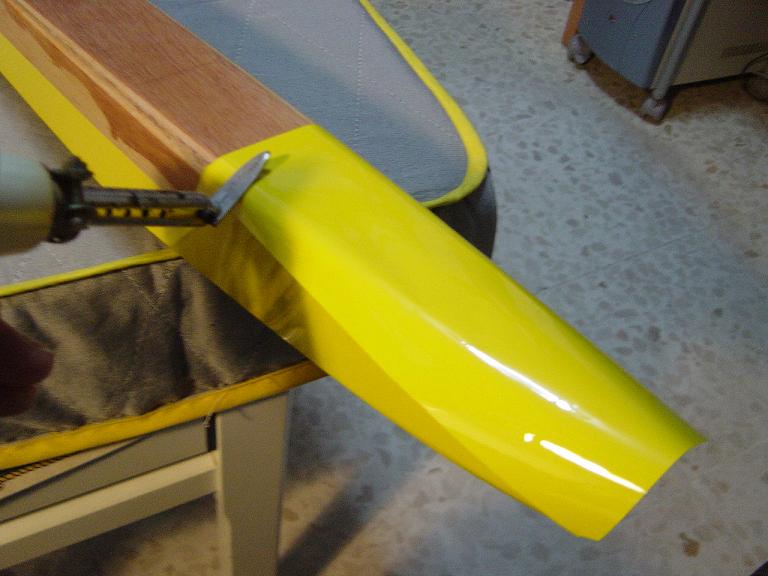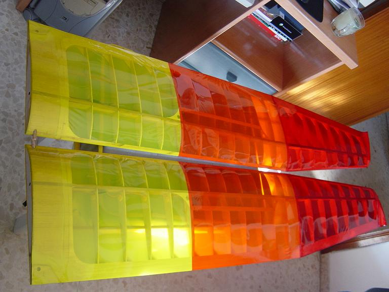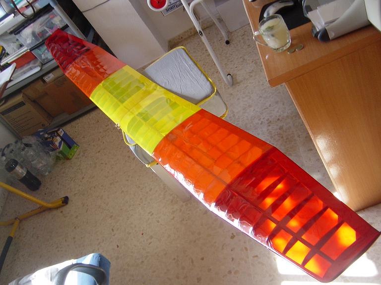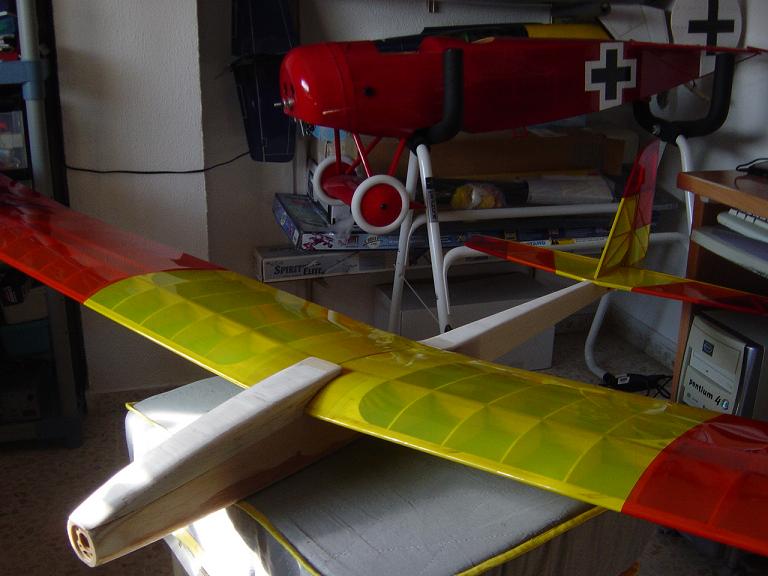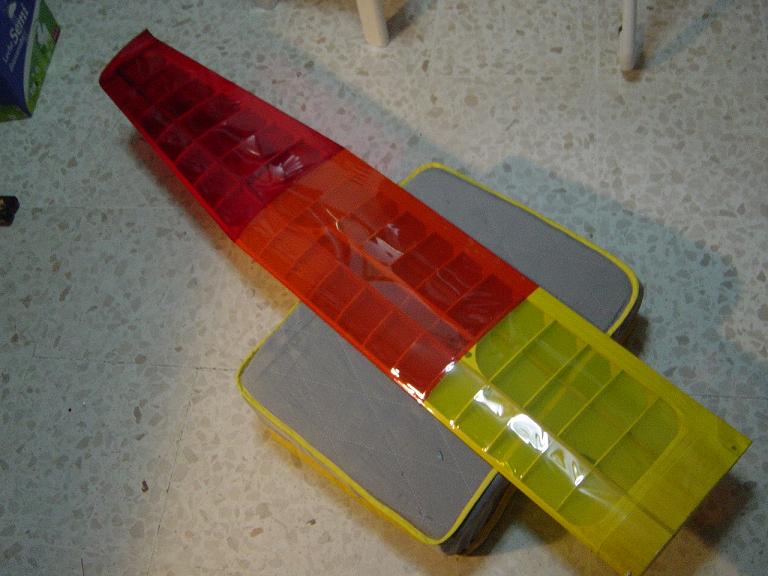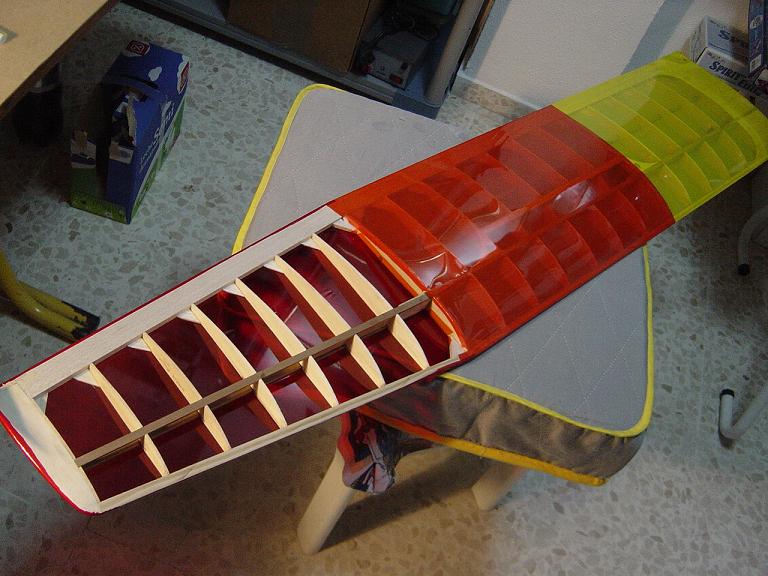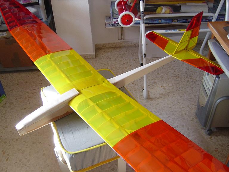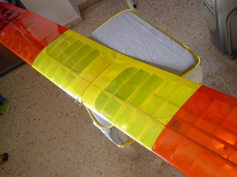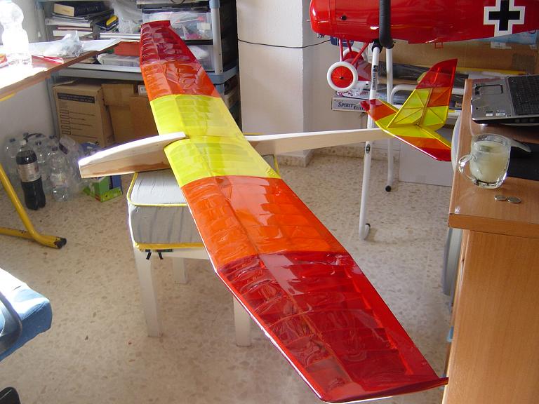 Ya para las alas utilizamos plantillas de papel manila para poder posicionar bien el patrón sobre los rollos de monokote, ajustar bien las piezas y economizar un poco más. Como siempre empezamos por la zona central amarilla, para pasar acto seguido al naranja y por último a las orejuelas rojas. Es una decoración de gran visibilidad y ayuda bastante a la orientación del modelo en el vuelo térmico a gran altura; relativamente sencilla y funcional.
