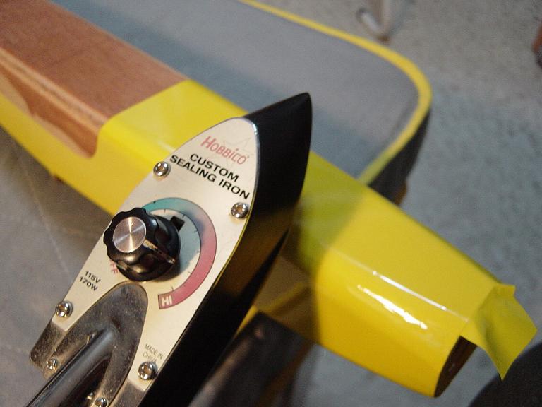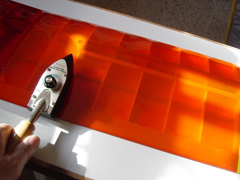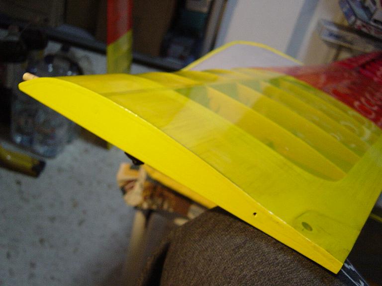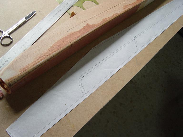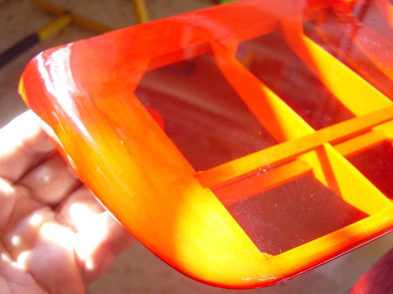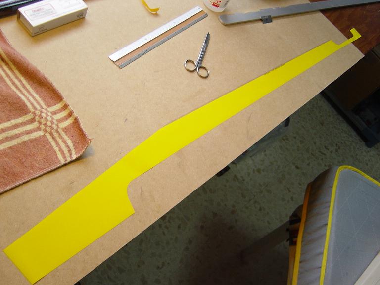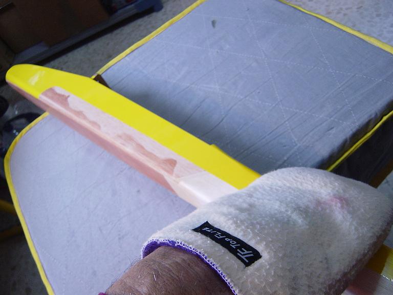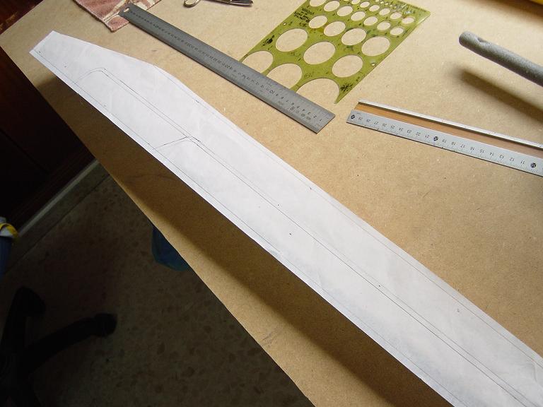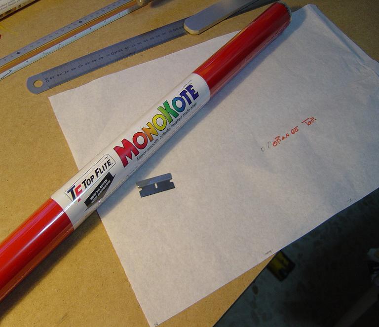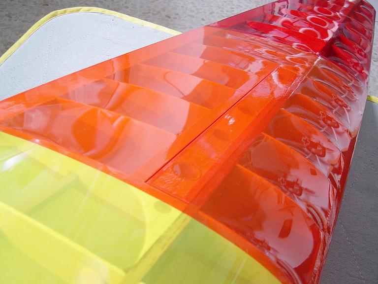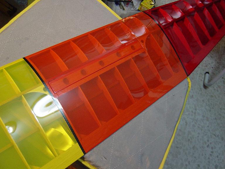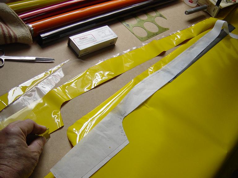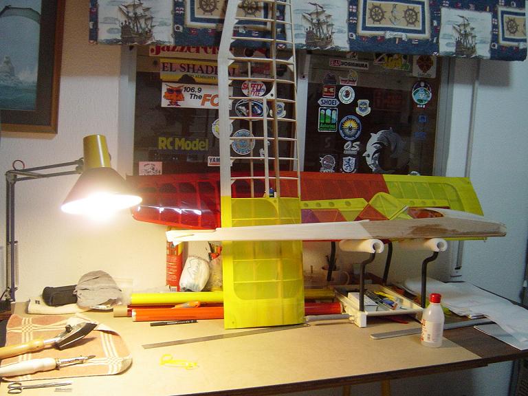 Ya para las alas utilizamos plantillas de papel manila para poder posicionar bien el patrón sobre los rollos de monokote, ajustar bien las piezas y economizar un poco más. Como siempre empezamos por la zona central amarilla, para pasar acto seguido al naranja y por último a las orejuelas rojas. Es una decoración de gran visibilidad y ayuda bastante a la orientación del modelo en el vuelo térmico a gran altura; relativamente sencilla y funcional.