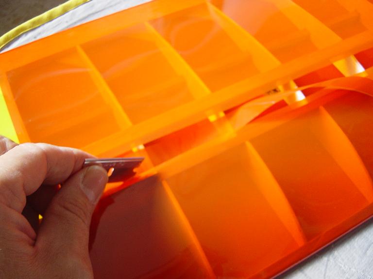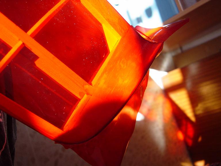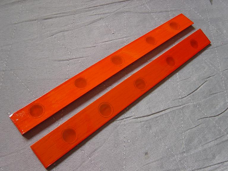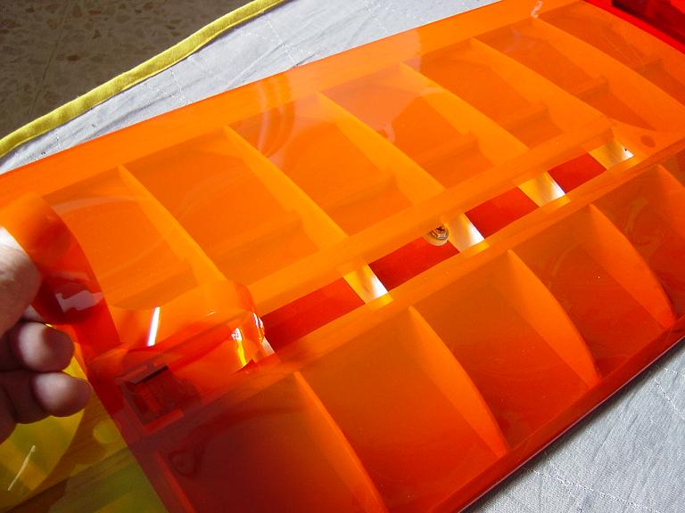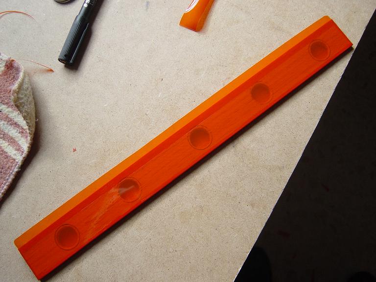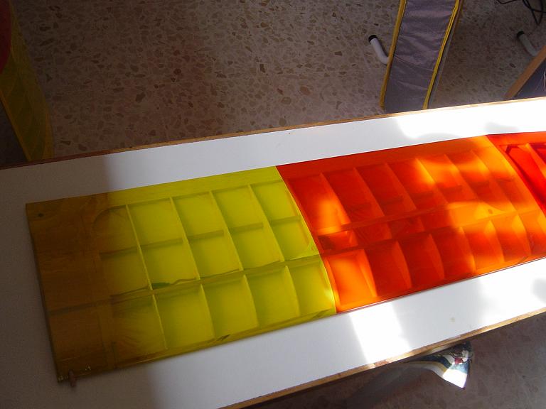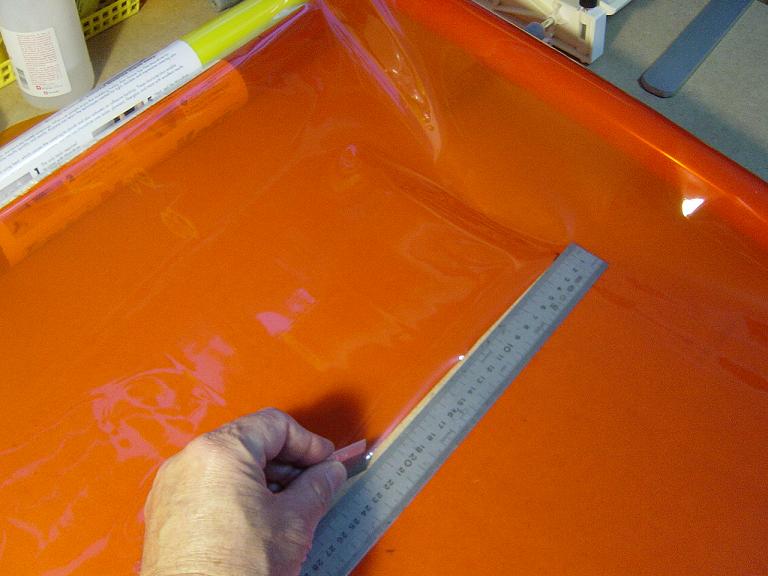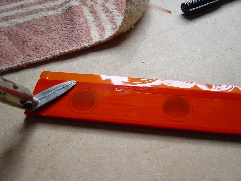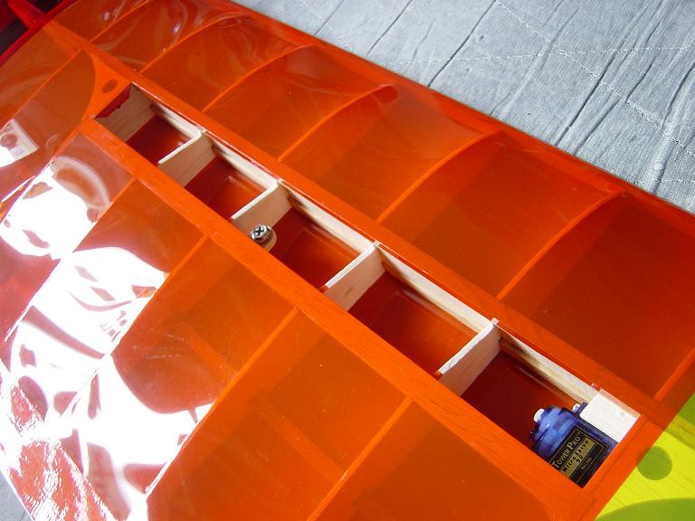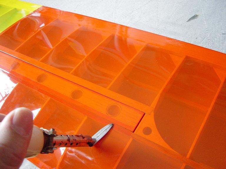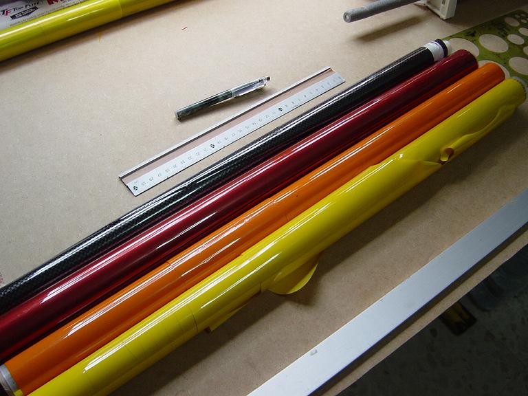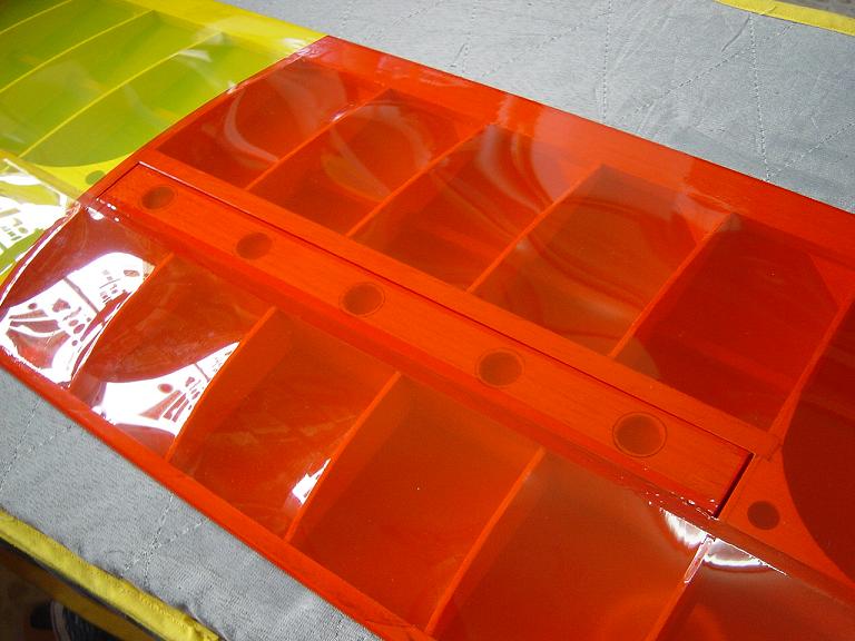 Ya para las alas utilizamos plantillas de papel manila para poder posicionar bien el patrón sobre los rollos de monokote, ajustar bien las piezas y economizar un poco más. Como siempre empezamos por la zona central amarilla, para pasar acto seguido al naranja y por último a las orejuelas rojas. Es una decoración de gran visibilidad y ayuda bastante a la orientación del modelo en el vuelo térmico a gran altura; relativamente sencilla y funcional.