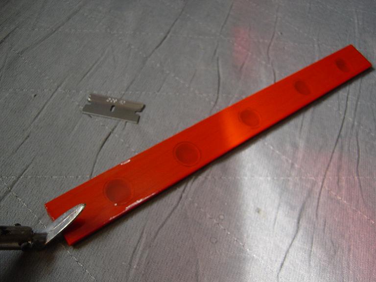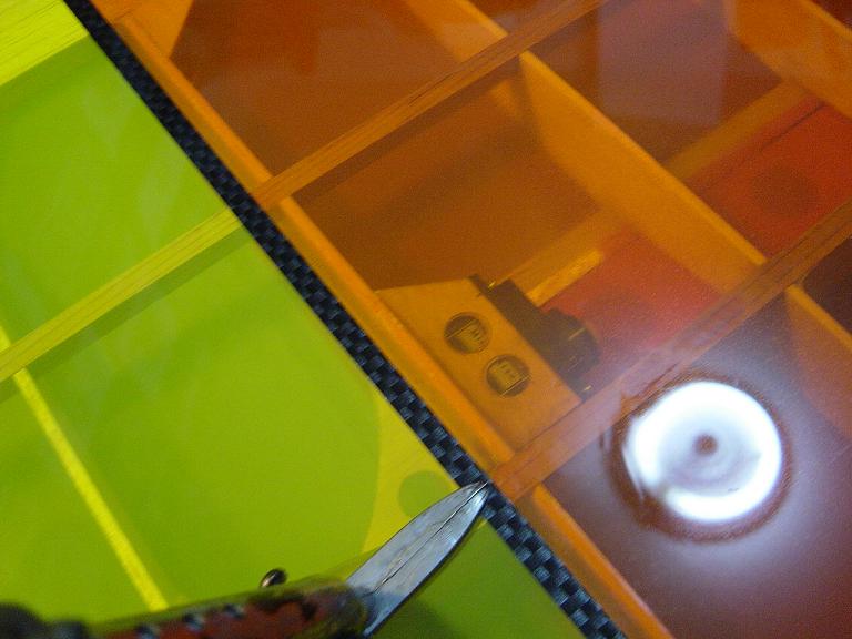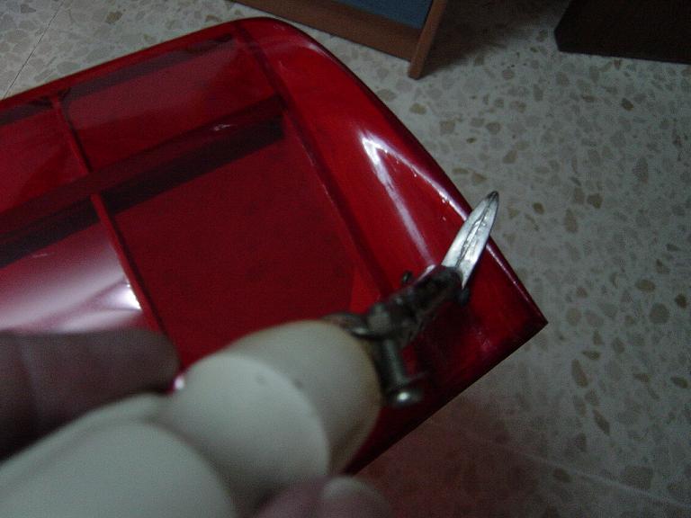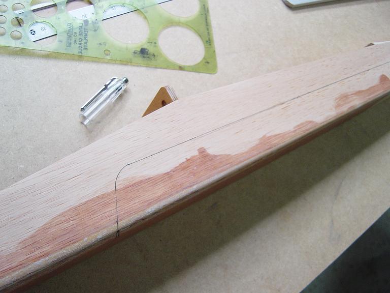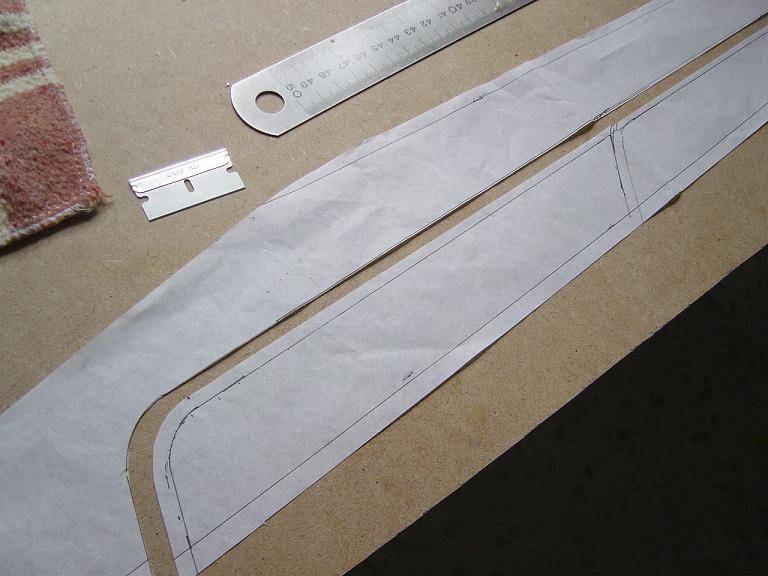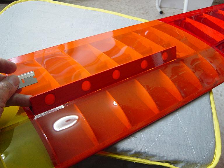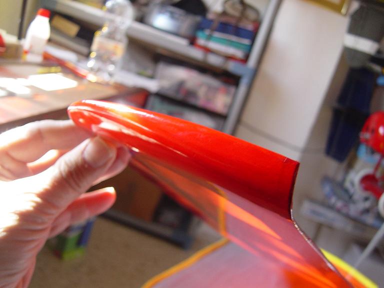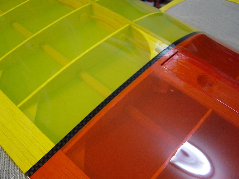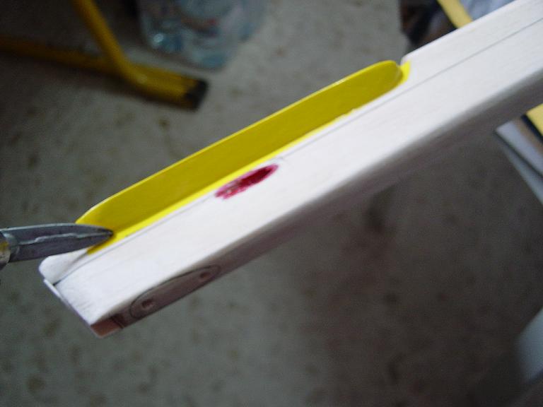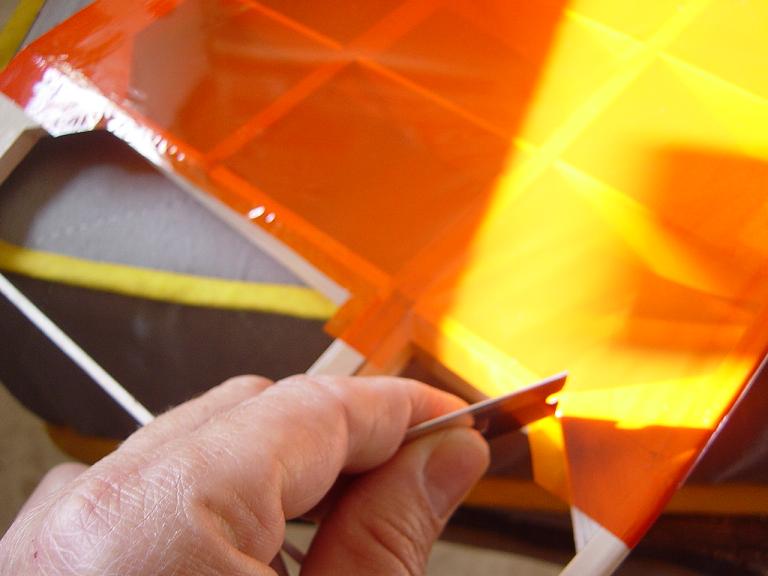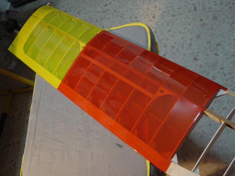 Igualmente las piezas que van encima de otras no las cortamos justamente encima de las costillas sino que dejamos un margen extra de esos 5mm. anteriores, procurando ajustar los cambios de color para que encajen en los bordes de ataque y salida. Mas tarde y con el ala bien tensada colocaremos unas tiras decorativas en esas uniones como en el modelo original que tambien sirven para reforzar un poco esas uniones, pero si lo hacemos bien no tienen porque despegarse.