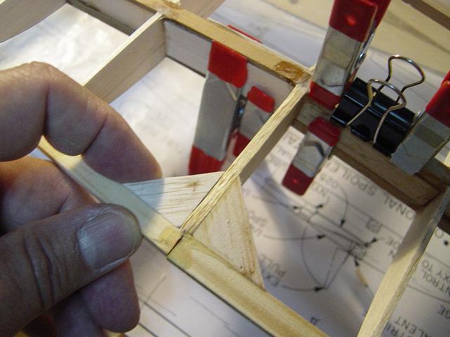 8) Seguimos otro ratito. Bien seca la unión del diedro en las orejuelas retiramos la semiala del tablero de montaje y pegamos en su angulo correcto las escuadras triangulares en la costilla pero esta vez por el lado de la orejuela. Tendremos que recortar un poco la escuadra para conseguir el angulo adecuado.