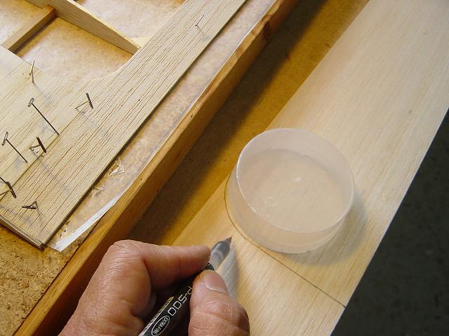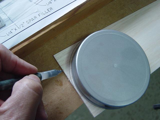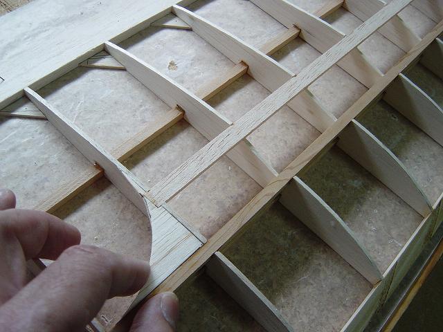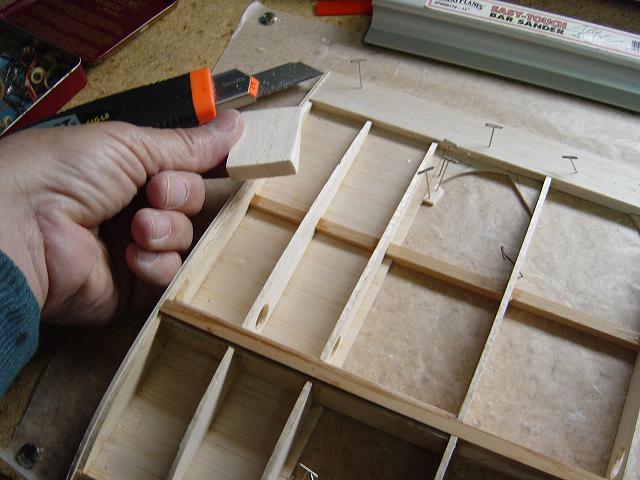 Igualmente y dentro de los detalles tambien hemos procedido a colocar sendos tacos de balsa entre las dos primeras costillas cerca de los bordes de ataque y salida antes de proceder al enchapado de estas zonas. La misión de estos tacos es por un lado el trasero el permitir la instalación de las bayonetas de alineamiento de las semialas y por el otro el que como hemos expuesto, vamos a modificar el montaje del ala que será atornillada en vez de con dowels de sujección por gomas mediante redondos de haya. Estos tacos internos de madera nos permitirán mas tarde efectuar los taladros para los tornillos de sujección y proveeran una base para que al apretarlos el enchapado no se hunda y ofrezca un buen agarre. El taco de balsa interno, junto con el reforzado con una tira de tela de fibra u organdí y epoxy diluído mas una plaquita superior de contrachapado nos darán una sujección bastante firme de las semialas en su parte trasera.