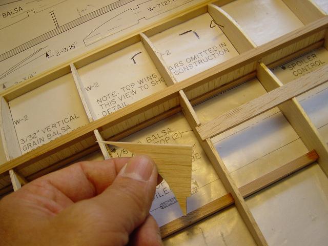 Procedemos al pegado de listones, placa de finlandés de 2mm. de refuerzo en la parte trasera de la viga central, ambas mitades de la costilla de 5mm. de la unión, triangulos de refuerzo en la zona de los planos centrales y ya de paso, aprovechando que tenemos la semiala en el tablero hemos procedido a añadir de nuestra cosecha unos triangulos de balsa de 2mm. en los laterales de los spoilers a fín de que mas tarde a la hora del recubrimiento este tenga más lugar en donde sujetarse cuando cortemos el hueco para la bahía de los aerofrenos.