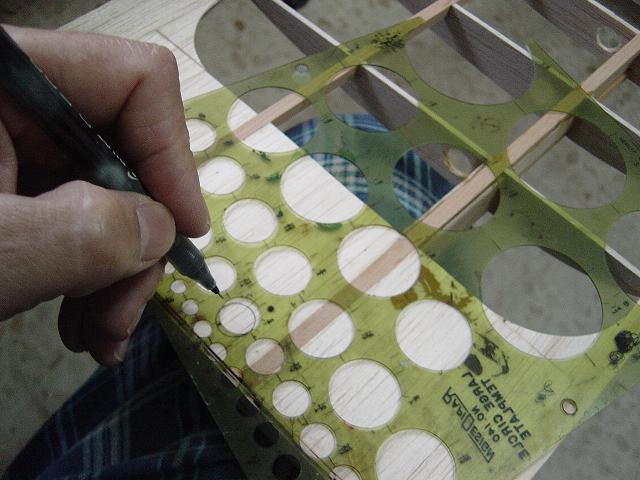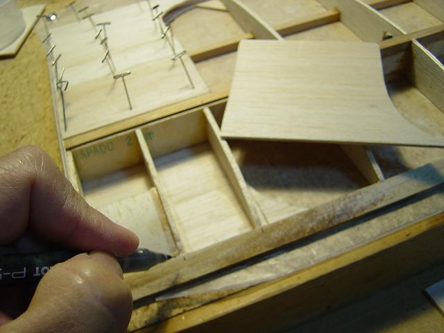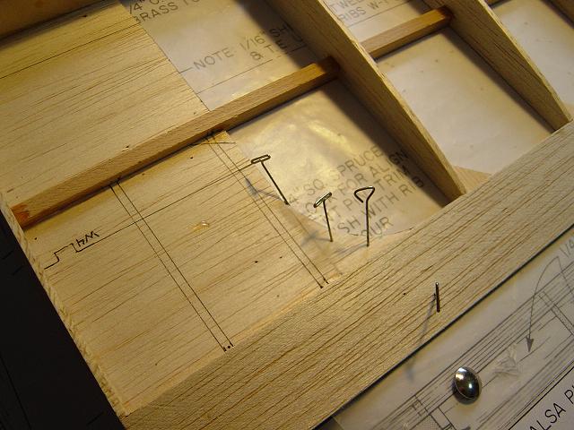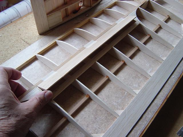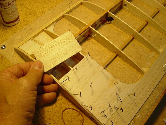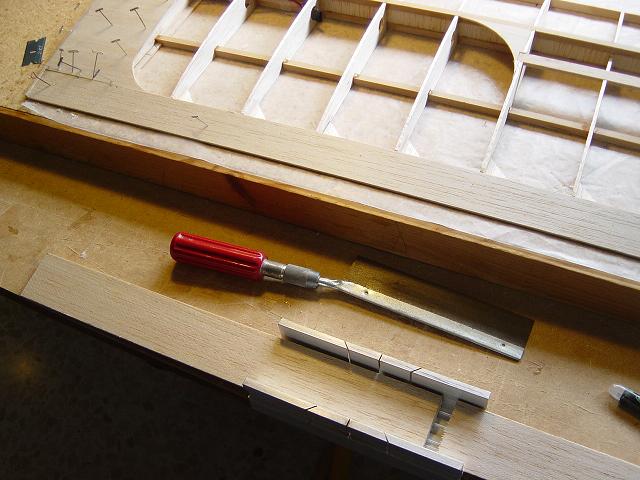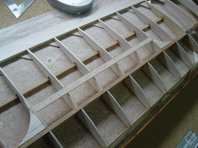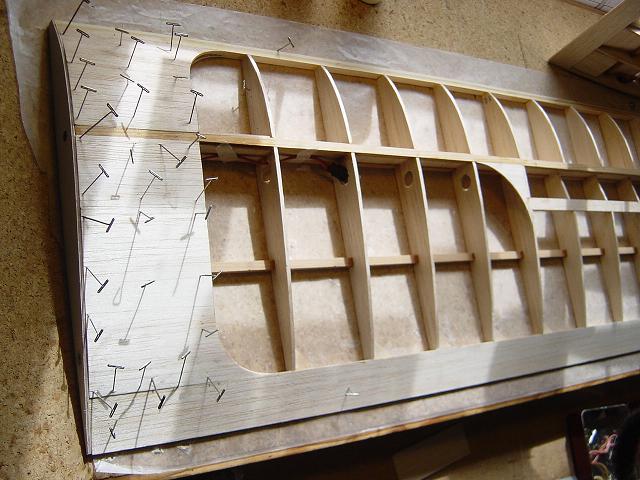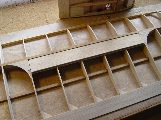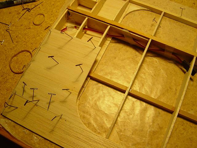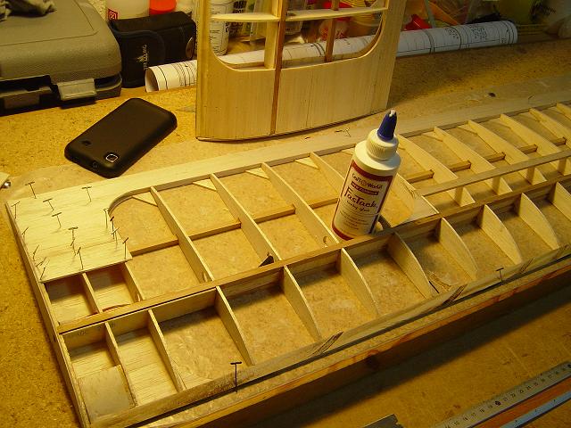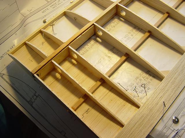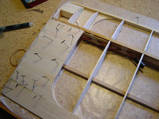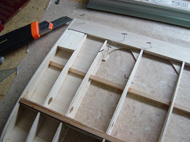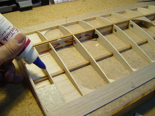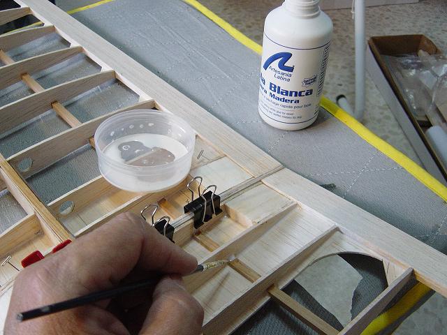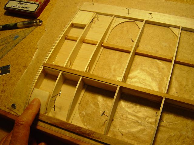 Igualmente ponemos otros homólogos de menor tamaño en la zona del enchapado inferior central del ala y pegamos ya las partes traseras de las dos costillas internas. :wink: