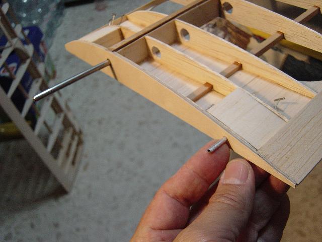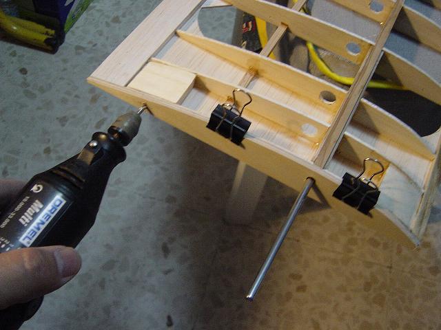 Bueno, pues lo que hemos hecho es instalar y alinear el pin trasero. Como recordareis lo hicimos con una varilla de carbono de 3mm. y bayonetas en aluminio. No aporta mucho o nada practicamente a la resistencia extructural del ala pero ayuda a posicionarla y manipularla durante las labores de montaje y desmontaje. Taladramos a la medida correcta con una broca de 3mm. la costilla del encastre de las semialas en contrachapado y bien alineado, transferimos el taladro a la otra semicuaderna. Colocamos la bayoneta principal para tomar referencia del angulo correcto y ese mismo angulo es con el que deberíamos de realizar los taladros en el taco de madera para instalar los tubos de aluminio. Sería conveniente acertar a la primera, pero si no fuese así, tan sólo se repasa el taladro con otra broca un poco mayor y volvemos a montarlo colocando algo más de epoxy.