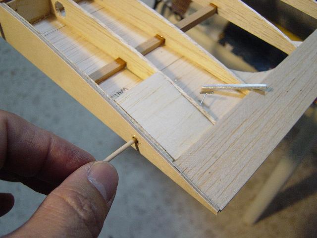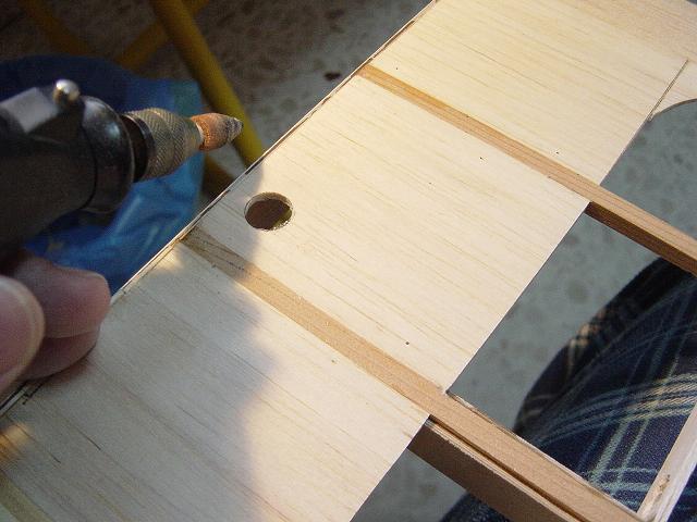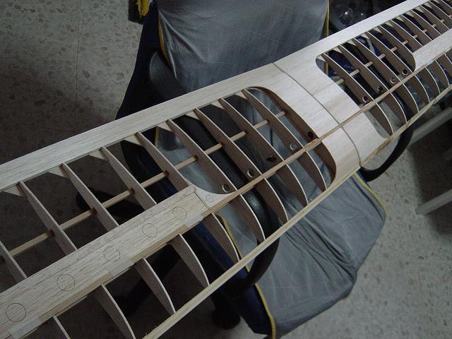 El taco de balsa dura interno de la parte delantera servirá igualmente para encastrar los tetones de redondo de haya que afianzaran las semialas una vez que atraviesen la cuaderna principal del fuselaje que modificaremos al efecto. :wink: Ya iremos viendo con detenimiento todo estas modificaciones.