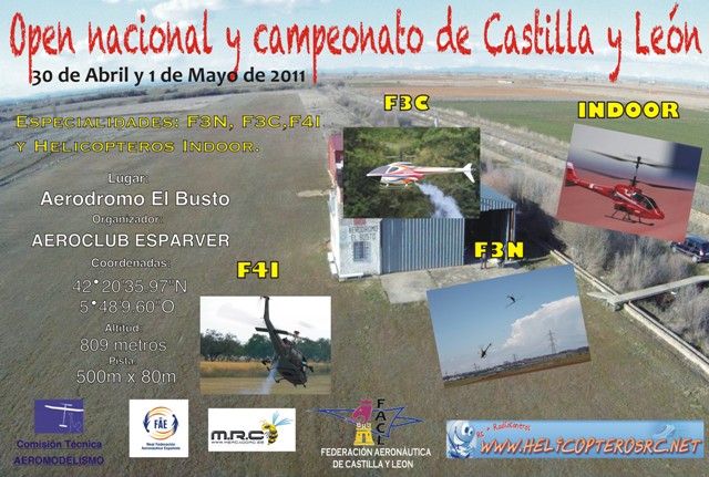 El Club Esparver, por delegación de la Comisión Técnica Nacional de Aeromodelismo, organiza el Campeonato de Acrobacia F3C , Acrobacia Freestyle F3N y Maquetas F4I de Helicópteros de R.C. , que tendrá lugar los días 30 de Abril y 1 de Mayo de 2011.
