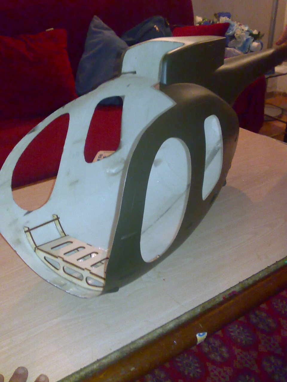Anes de meter el heli en el fuselaje lo primero que debeis hacer es quitar el rotor de cola, por lo menos en el titan no hace falta rebajar nada el final de la cola.
