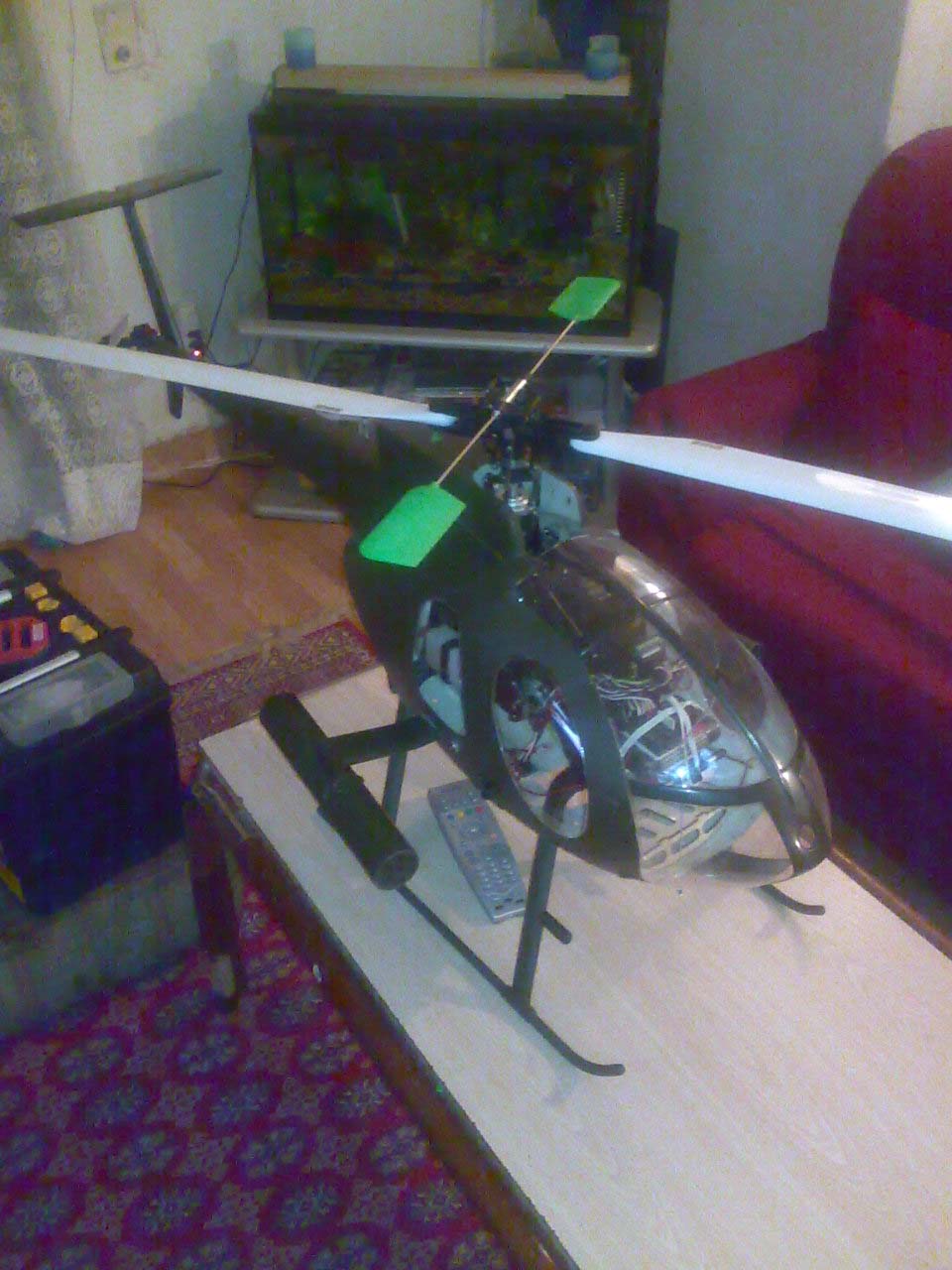 Vista lateral terminado, lo que se ve debajo del helicoptero aunque parezca un mando de la tele es la nueva emisora futaba j16 de 5,14Ghz, es asi de compacta, je je