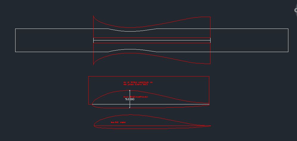Las palas ya las tengo hechas con madera de samba como las vuestras. La longitud de las palas las voy a adaptar en base a la referencia que me has facilitado y que publicáis en vuestro blog, por lo que calculando las mismas en función al peso me dan aproximadamente un rotor de 1800 mm. Quedan bastante bien pero me han salido con un espesor de 7 mm. Creo que es poco, por lo que he modificado el perfil que voy a utilizar (naca 8h12) incrementando dicho espesor y con ello pretendo mejorar también la sustentación, al menos espero sea este el resultado final. Por experimentar que no quede y esto me mantiene expectante a comprobar de que forma afectan dichos cambios.