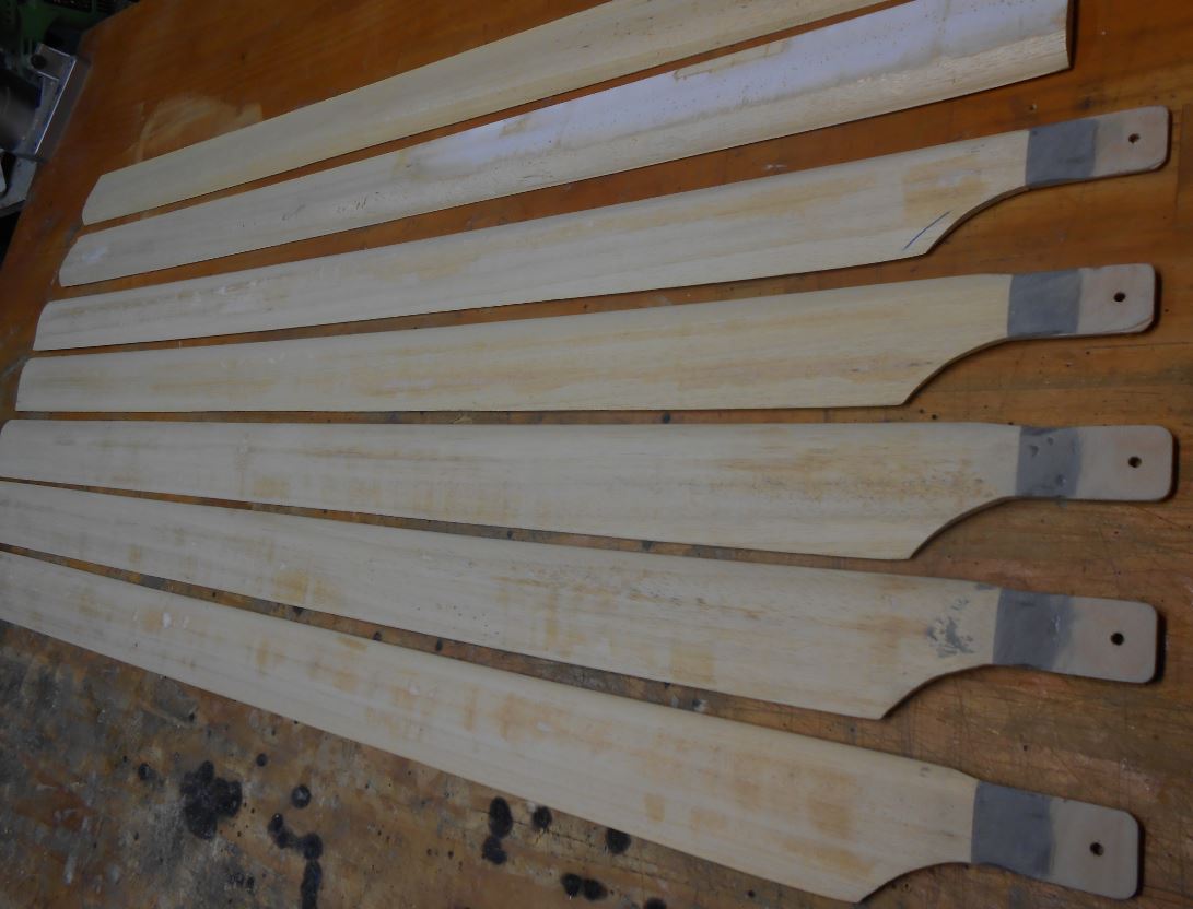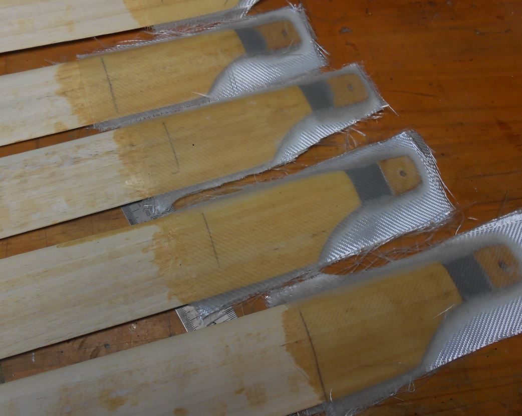 En este momento he terminado las palas, excepto dos que he tenido que reparar ya que en el proceso de fresado se me ha astillado por el extradós. Esto no es un problema y las reparo con una masilla de epoxi que sustituye a la madera y a su vez tiene un comportamiento estructural superior. Las palas van ajustadas de forma que tiene una ángulo negativo de 2º y esto se hace colocando un asiendo de balsa de 2 mm longitudinalmente a lo largo de la pala en el extremo del borde de fuga y con esta inclinación se pega un rectángulo de contrachapado en el extremo de la pala que será el encargado de sujetar las palas al rotor. Este ha de reforzarse con varias capas de fibra de vidrio ya que esta zona esta expuesta a todas las cargas que sufran las palas y es un elemento a cuidar en su construcción. La inclinación de la palas con 2º negativos es más compleja su construcción pero permite un inicio de autorrotación más rápido que con ángulos neutros o positivos, por lo que es claramente visible la respuesta del rotor en cualquier circunstancia de vuelo.