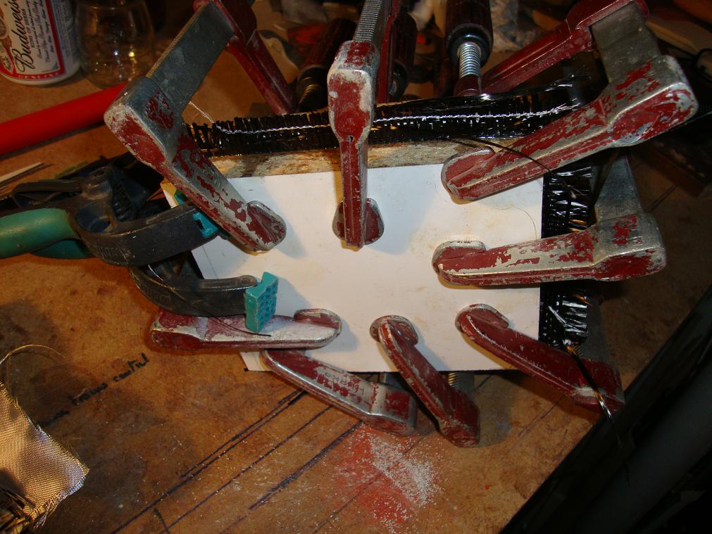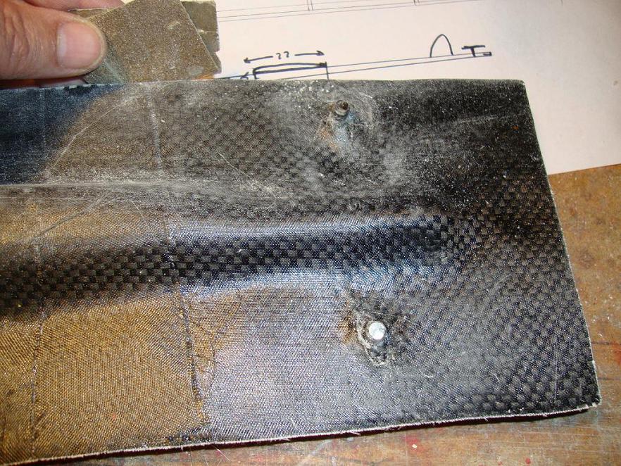 Mientras nos fabricamos un molde y solo para pasar el rato, podemos fabricarnos con 2 tablas enceradas, unos gatos y algun retal sobrante, una placa de carbono. Un par de brochazos, una capa de tela o bien dos o tres, presión y hala.