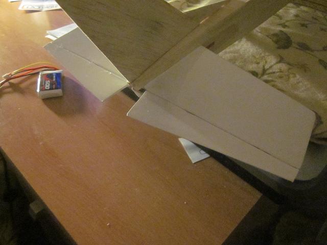 No hay gran cosa que mostrar ahora mismo... simplemente que ya he entelado tambien el estabilizador vertical y el timon, y ya estan montada las dos superficies de cola con sus varillas de transmision puestas y listas para usar.