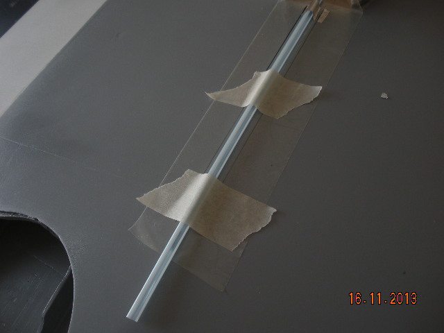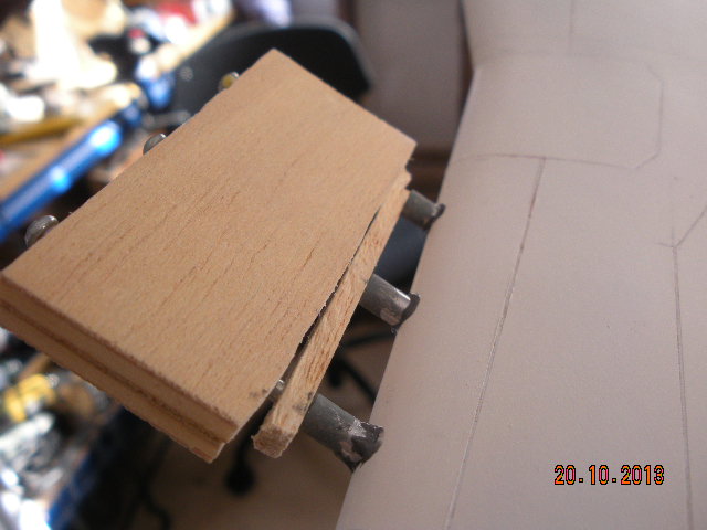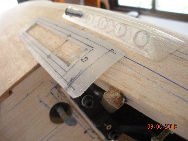 Uno de los defectos que mas veo en los P-51 es que los escapes se colocan pegados en los costados de morro, cuando en realidad deben salir de dentro del supuesto motor. Para imitar este efecto yo he realizado una lámina de fibra sobre el morro ya moldeado para lugo incrustarla en la balsa para que quede rasante. Tambien he hecho el carenado de los tubos de escape en fibra para colocar despues unos tubos de aluminio con una plantilla de contrachapado para lograr que se alineen bien. Los tubos no están puestos aun. Espero que las fotos queden claras.